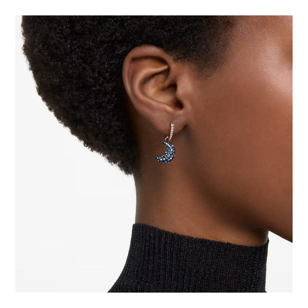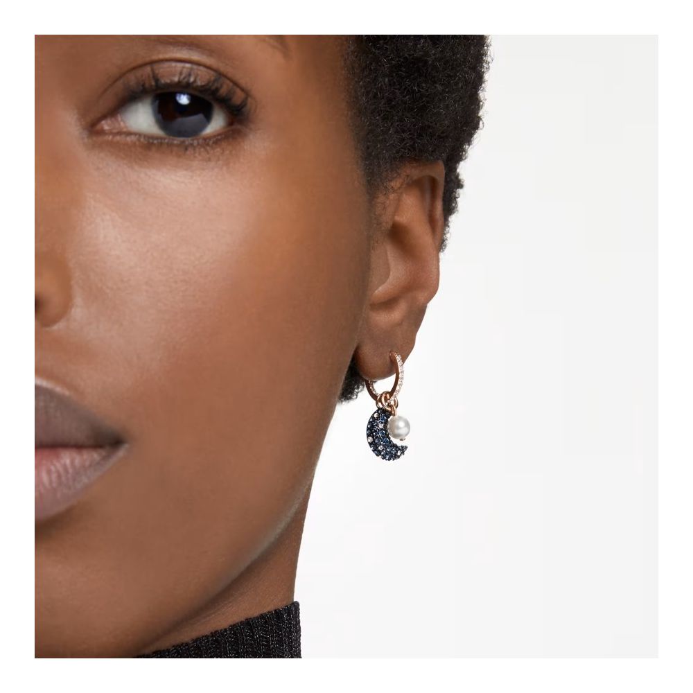 Estes radiantes brincos Sublima são uma homenagem chique aos reflexos e sombras da lua. O design lacado a rosa dourado apresenta um elegante par de luas crescentes, cada uma adornada com um pavé de cristais em tons escuros, suspensas em miniargolas deslumbrantes. Um brinco tem uma pérola amovível. Uma escolha perfeita, seja qual for a fase de estilo em que se encontra