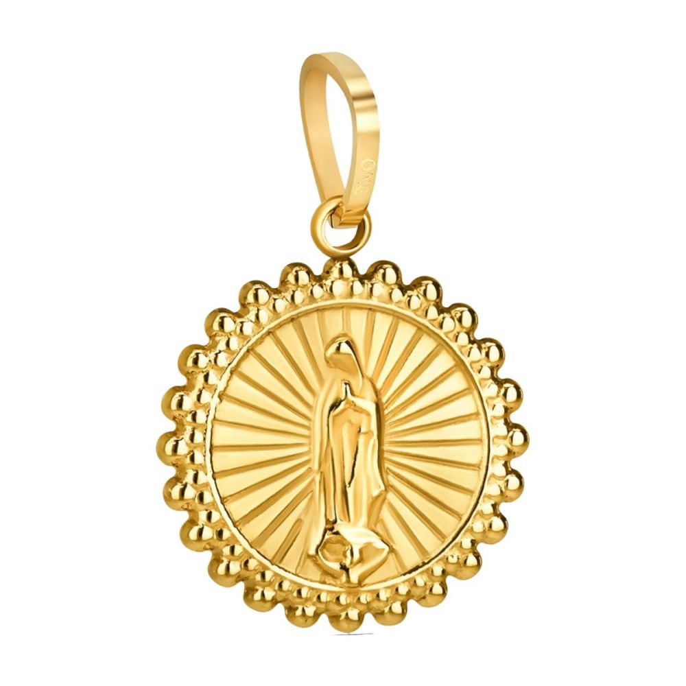 Charme em formato redondo dourado com borda recortada e com imagem de Nossa Senhora em relevo no centro do charme. Os charmes da coleção Energy for Life dão-te a possibilidade de contares a tua história de forma totalmente personalizada. Uma memória, um momento inesquecível eternizado ao pescoço ou pulso.