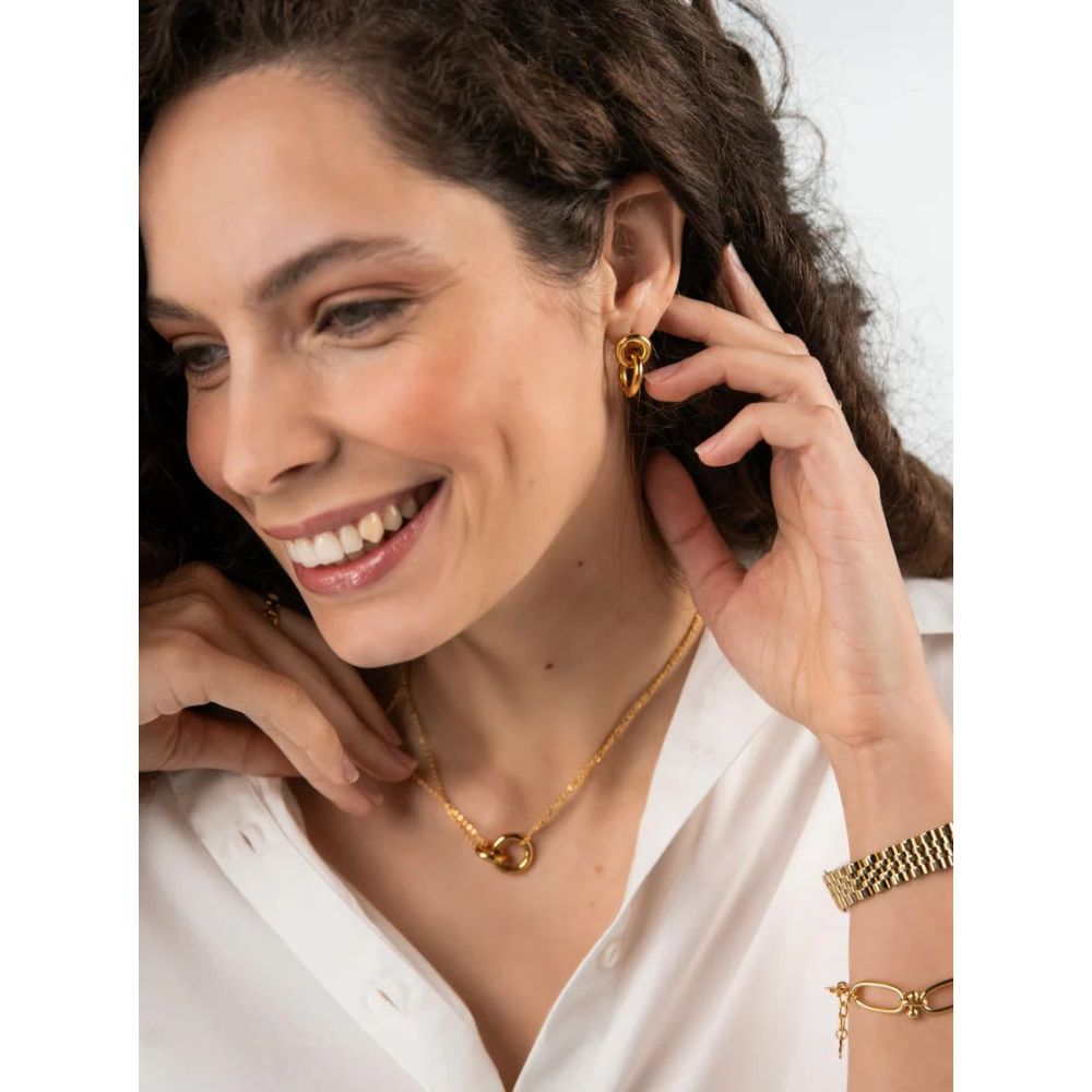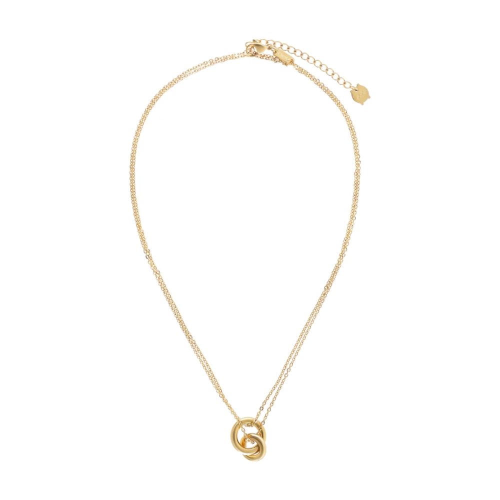 O colar Circle da coleção Luminous é uma peça delicada e elegante. Totalmente em dourado, o colar é composto por uma fina malha dupla de elos entrelaçados e por um pendente com duas argolas. As argolas douradas são totalmente lisas, têm diferentes tamanhos e estão ligadas entre si e cada uma por um dos fios do colar. O colar termina com um extensor que o torna ajustável a vários tamanhos e tem um fecho em mosquetão.