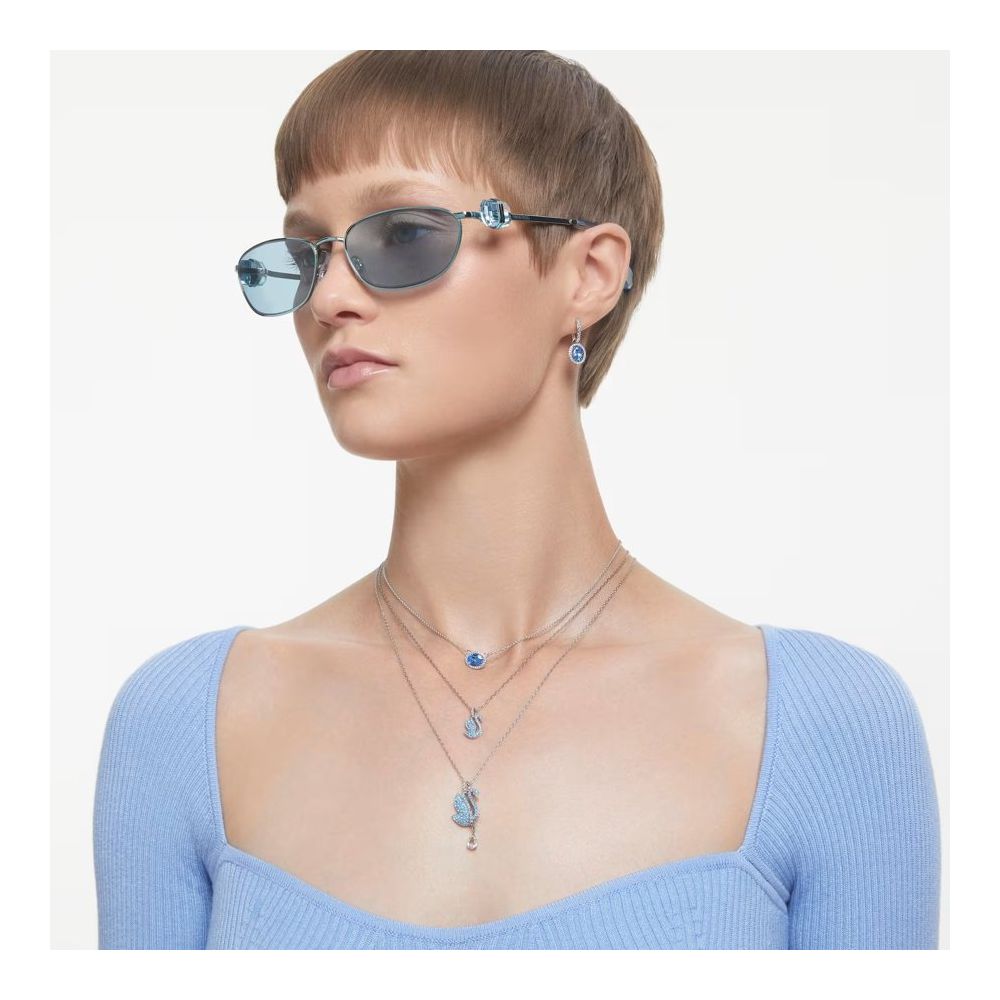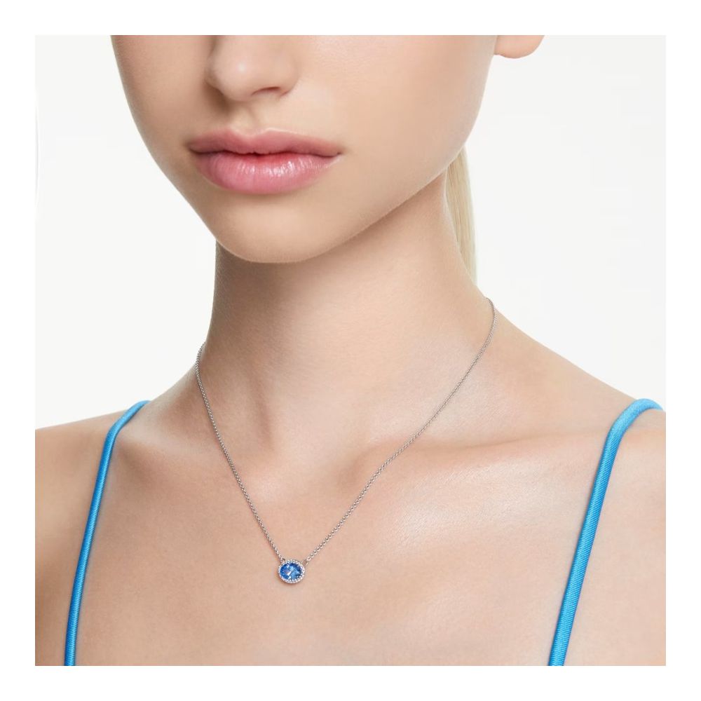 A corrente banhada a ródio apresenta uma zircônia Swarovski oval central, com um azul deslumbrante, emoldurada por um pavé de cristais redondos transparentes. Uma pedra adicional é colocada na extremidade do colar para um toque extra de luxo.