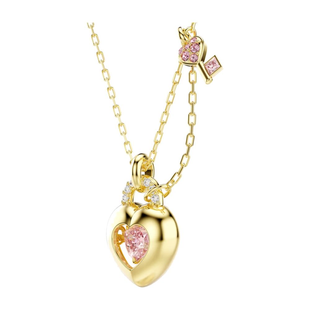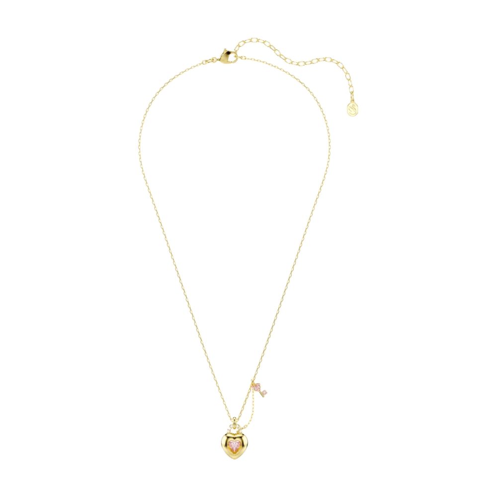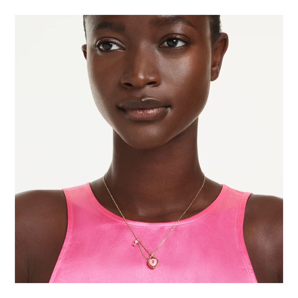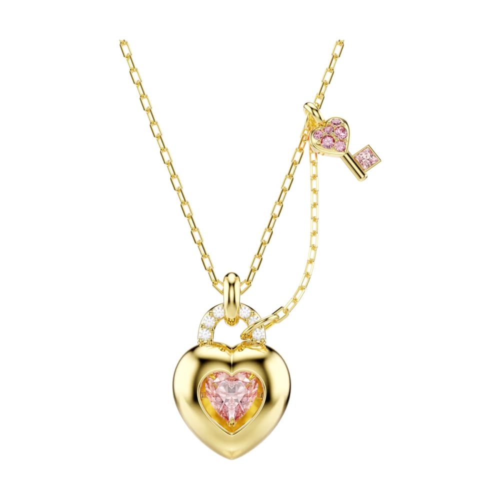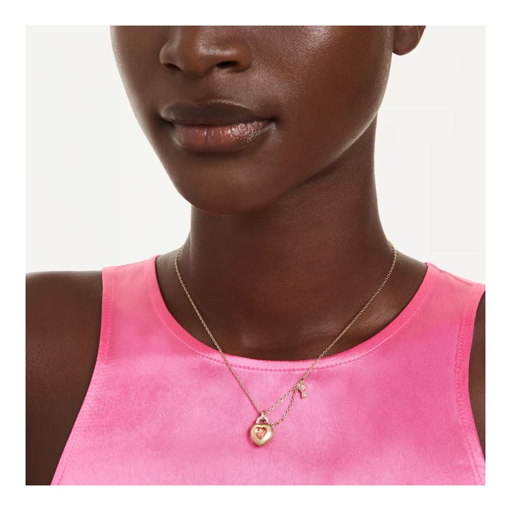 Guarde os seus segredos a sete chaves com este pingente inspirado em um relicário. O motivo em forma de coração apresenta uma pedra rosa que brilha, criando reflexos infinitos, enquanto o verso é rosa com um desenho simbólico de fechadura. A pequena chave presa à corrente também é adornada com cristais rosa, elevando o romantismo ao toque final.
