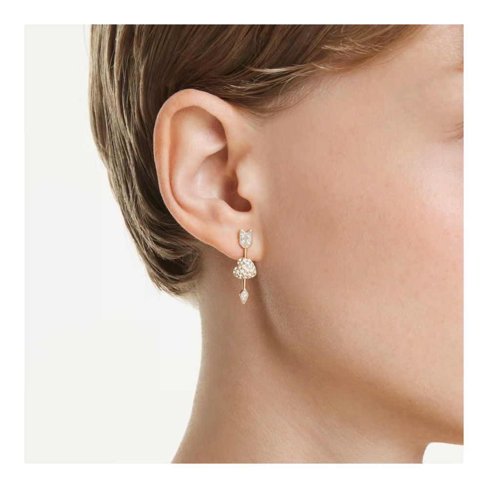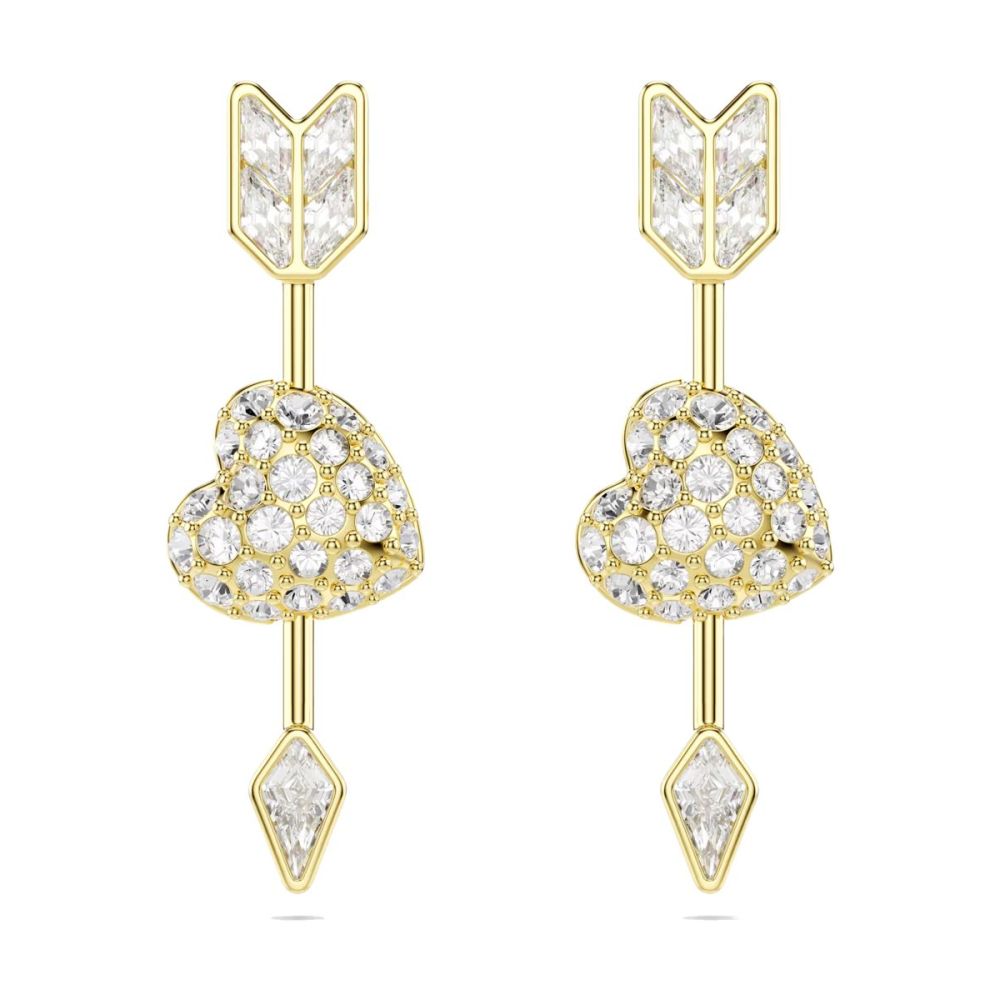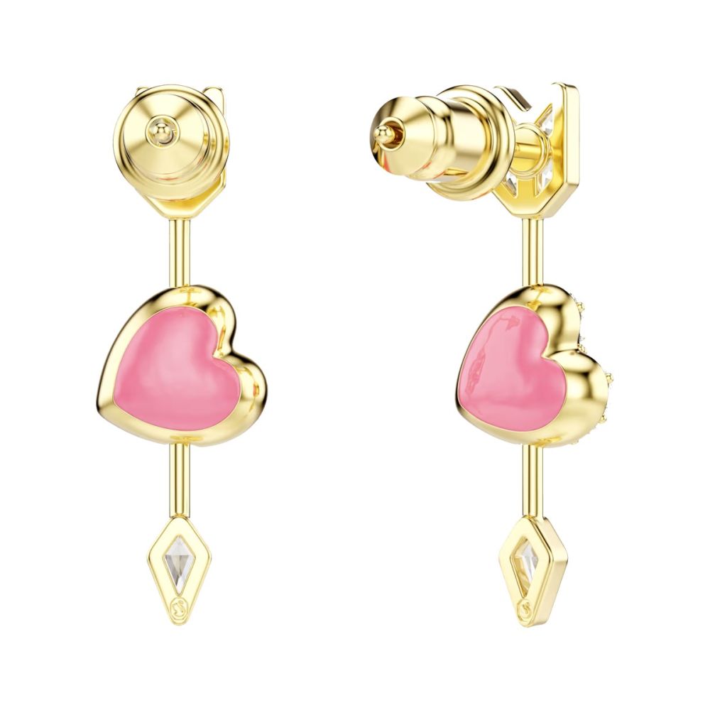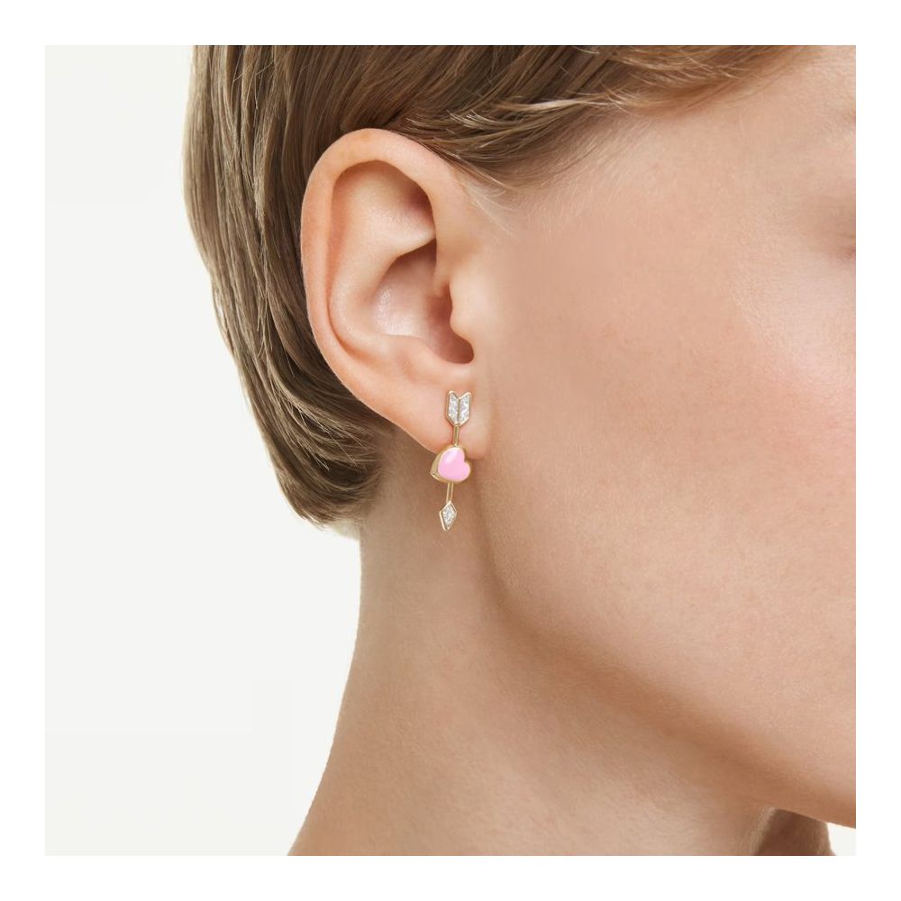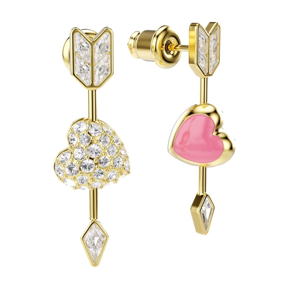 O Cupido ataca duas vezes nestes expressivos brincos Idyllia. Cada peça com revestimento em tom dourado apresenta um coração de amor atravessado por uma seta, com cristais incolores brilhantes de um lado e uma cor rosa viva do outro lado.