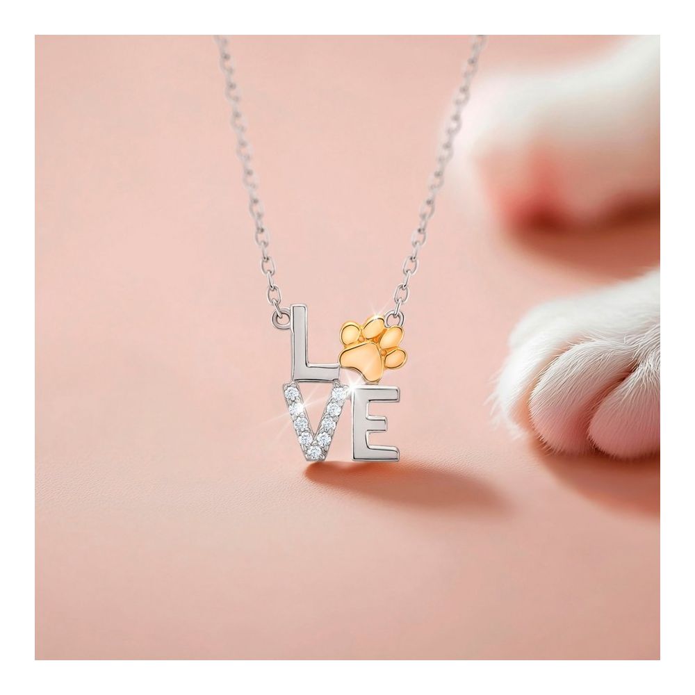 O seu pendente elegante combina a palavra "LOVE" com uma delicada pata de animal em banho de ouro. Uma das letras é ainda cravada com pedras zircónia, criando um brilho subtil e sofisticado.