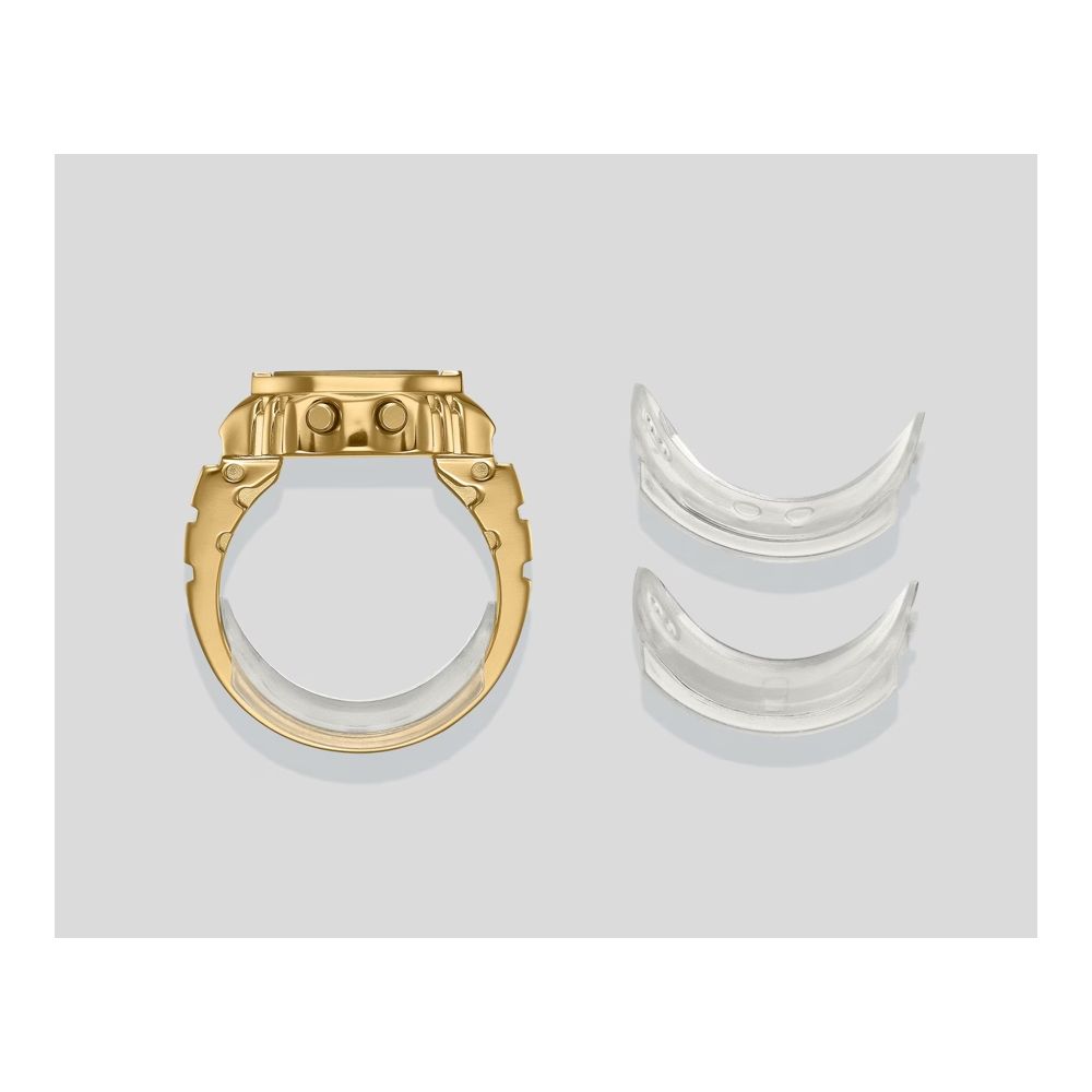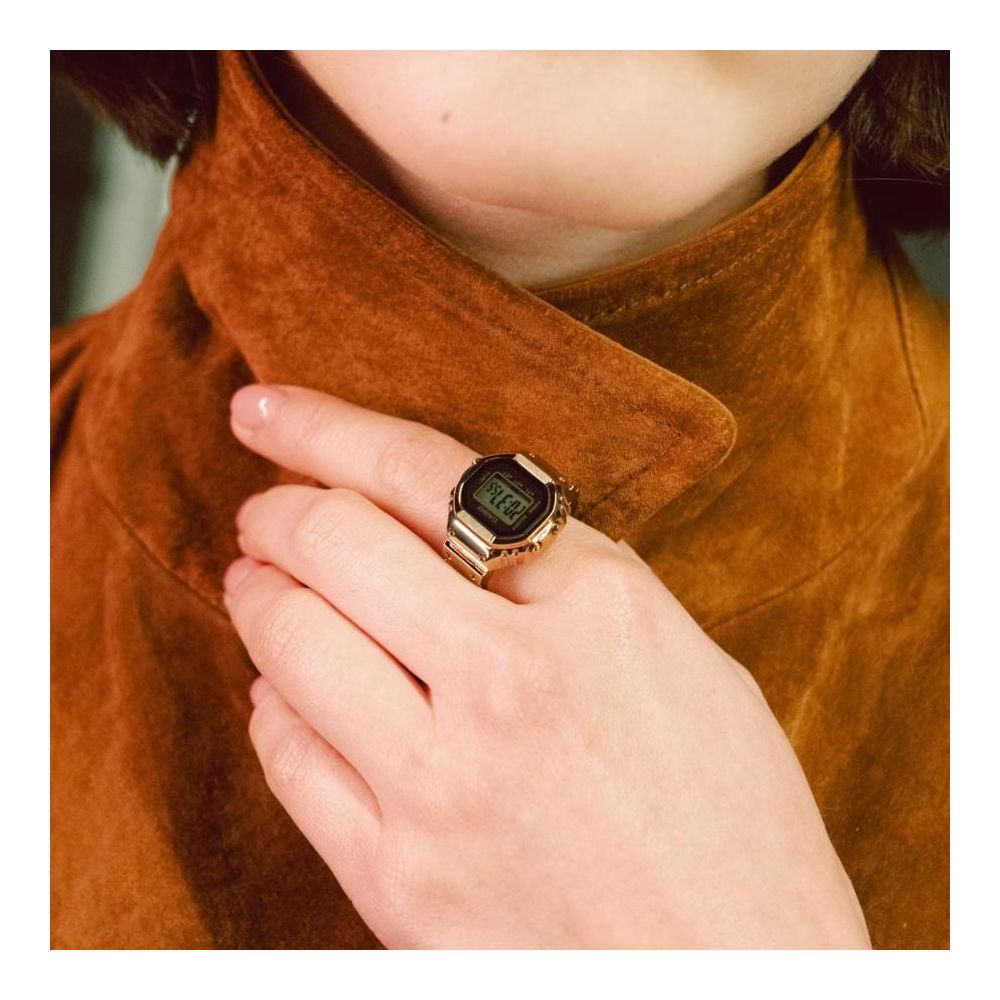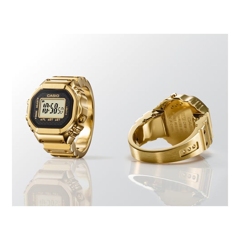 Casio Ring Watch 50th Anniversary CRW-001G-9ER para celebrar e comemorar o 50º aniversário da Casio Watch. Um estilo totalmente novo de relógio digital - prático e divertido - graças a um módulo em miniatura e a uma tecnologia avançada de trabalho em metal.