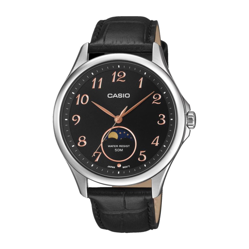 Relógio Casio Collection MTP-M110L-1AVER. Caixa com diâmetro aproximado de 42 mm, cor prateada e bracelete cor preta e mostrador cor preta. Está equipado com um movimento quartzo. O relógio é estanque até 50 m | 5 bar | 5 atm. Composição: aço e couro/pele.