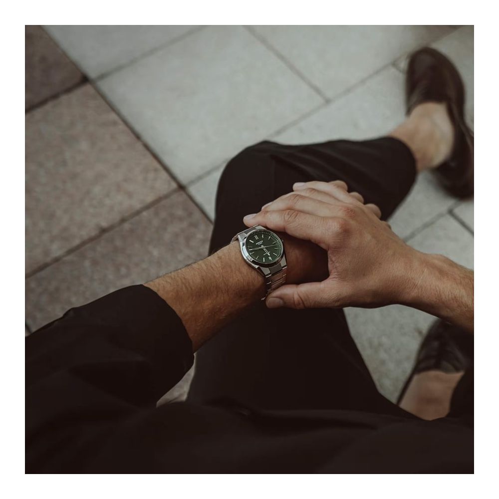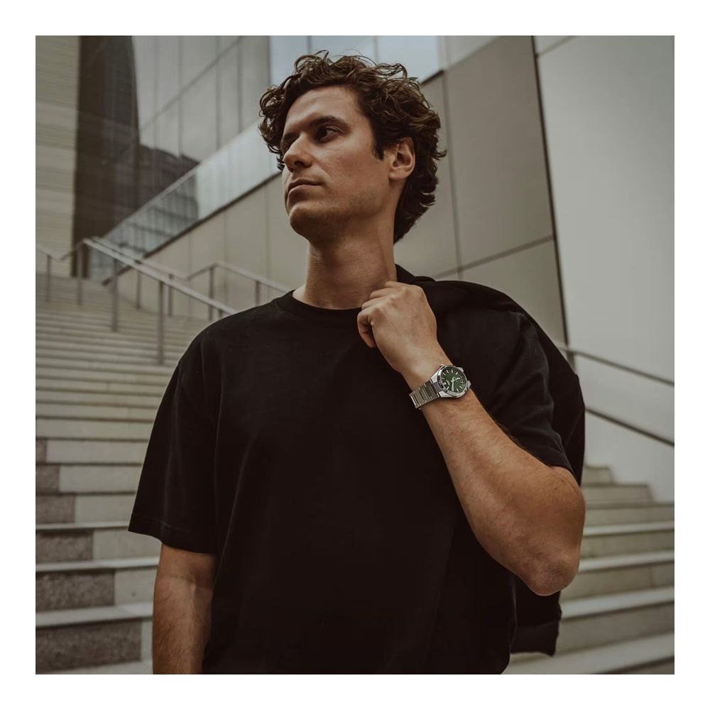 Caixa com diâmetro aproximado de 39 mm, mostrador cor verde, bracelete e caixa cor prateada. Está equipado com um movimento automático. O relógio é estanque até 100 m | 10 bar | 10 atm. Composição: aço e safira.