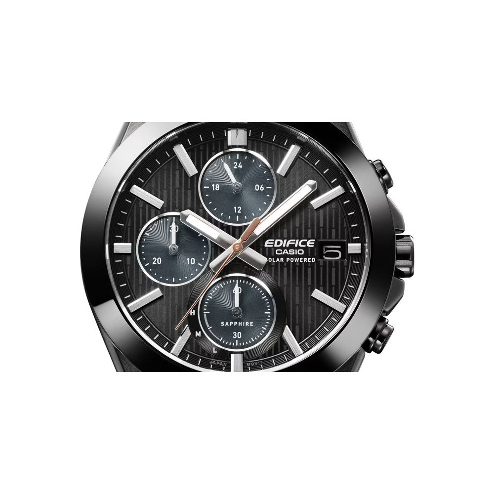 O vidro de safira garante visibilidade e resistência a riscos. Alimentado por energia solar para garantir uma longa duração da bateria e equipado com cronómetro e resistência à água de 10 bar.