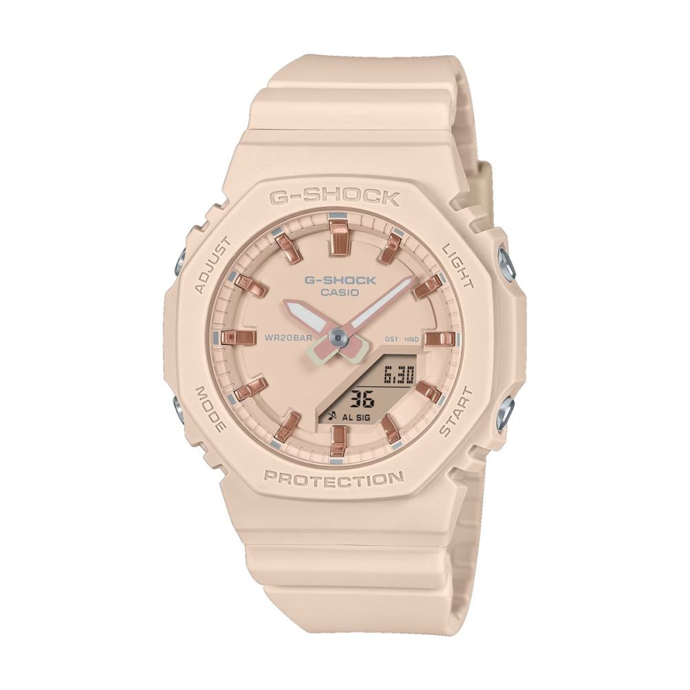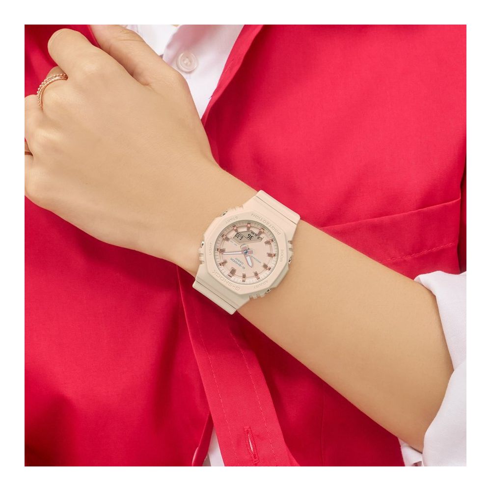 O GMA-P2100 apresenta índices elegantes com acabamento em deposição de vapor de ouro rosa e um design compacto para se adaptar a pulsos mais pequenos com total conforto.