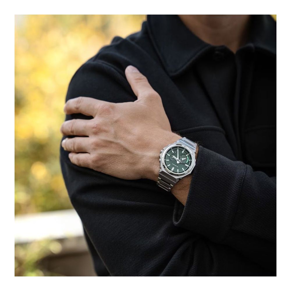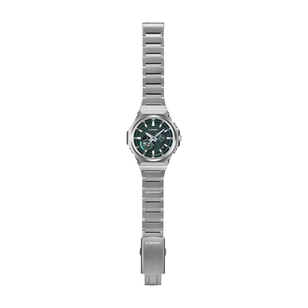 Caixa com diâmetro aproximado de 44 mm, mostrador cor verde, bracelete e caixa cor prateada. Está equipado com um movimento digital, quartzo, tough Solar (alimentação a energia solar). O relógio é estanque até 200 m | 20 bar | 20 atm. Composição: aço e carbono biológico.