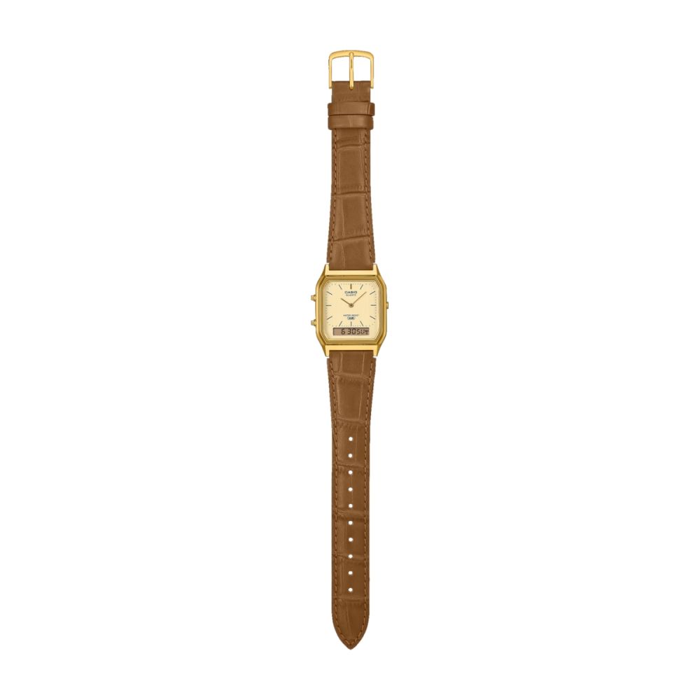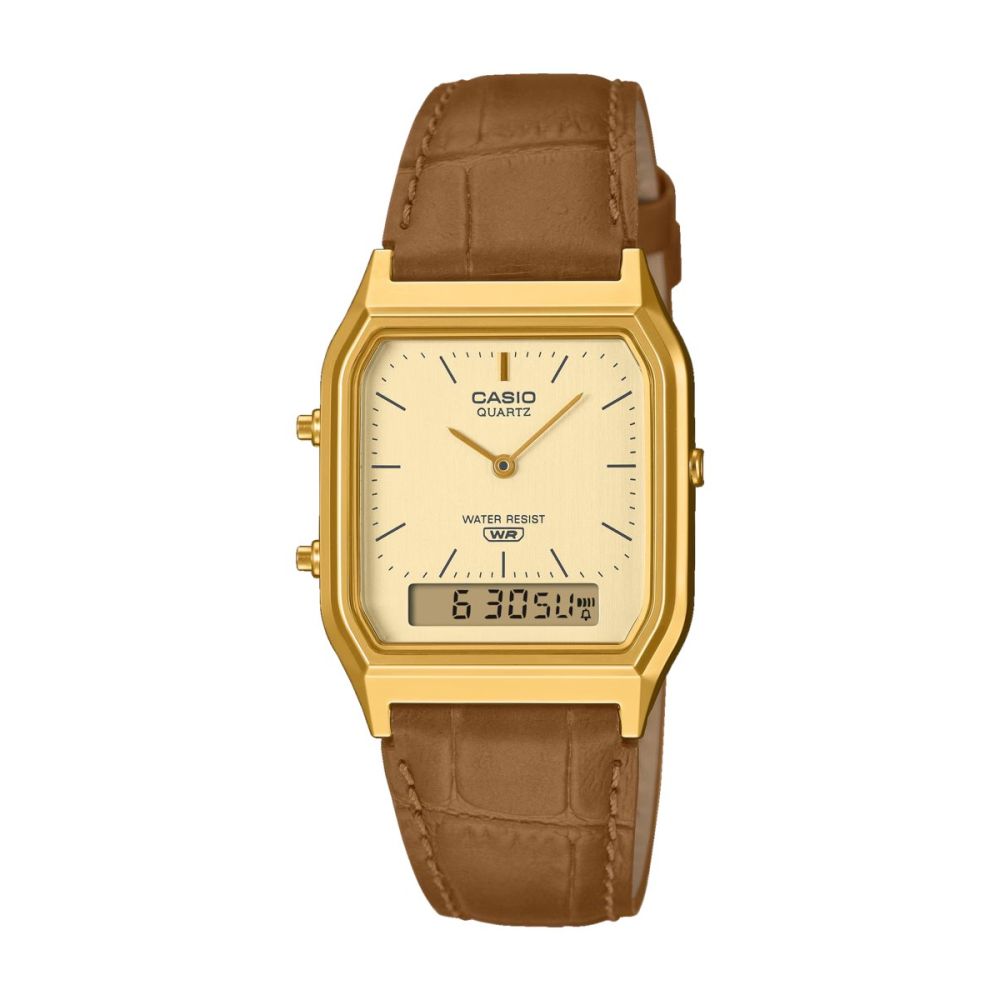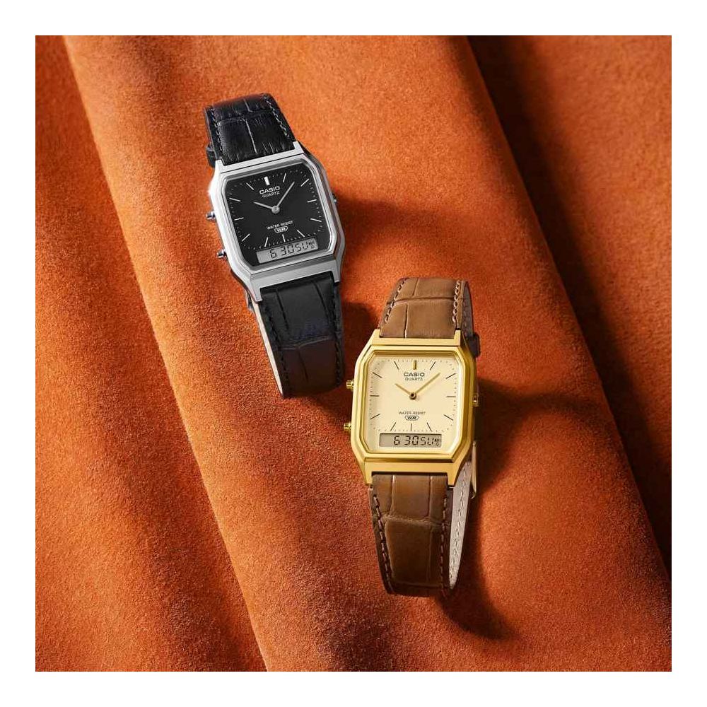 Baseado no popular AQ-230, o relógio oferece um visual elegante e refinado, bem como uma utilidade prática com resistência à água para uso diário, cronómetro, alarme e outras funcionalidades. O design clássico em relevo da banda confere um toque intemporal.