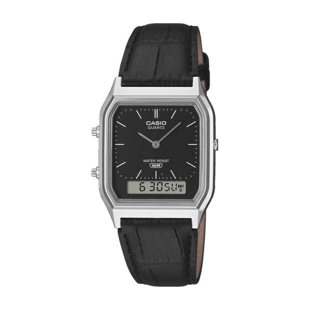 Baseado no popular AQ-230, o relógio oferece um visual elegante e refinado, bem como uma utilidade prática com resistência à água para uso diário, cronómetro, alarme e outras funcionalidades. O design clássico em relevo da banda confere um toque intemporal.