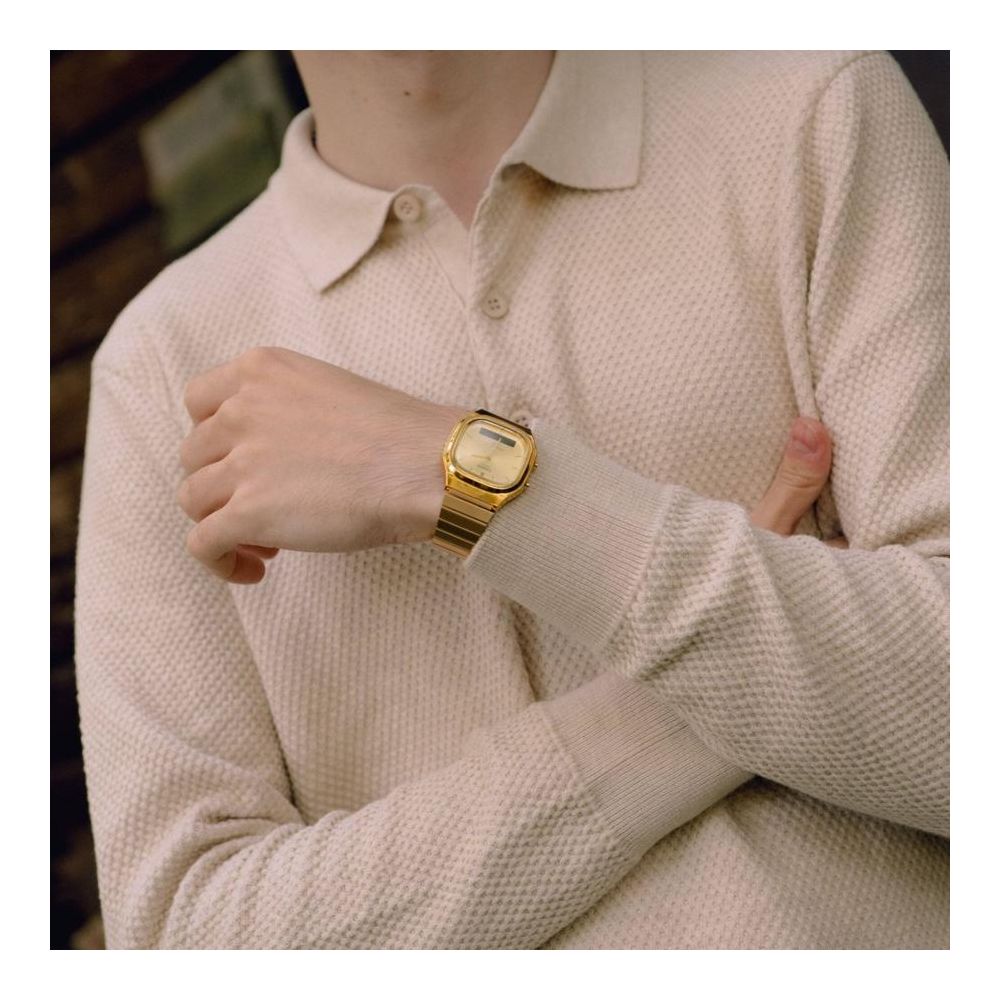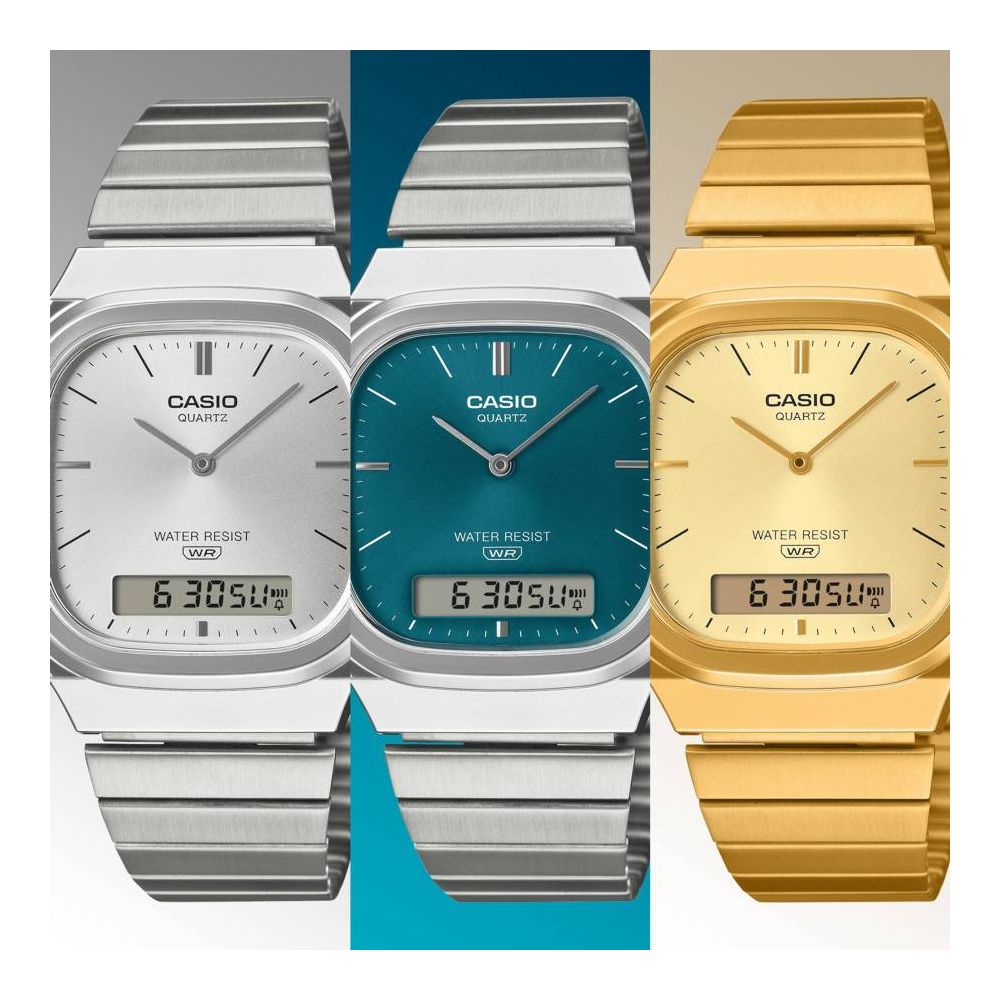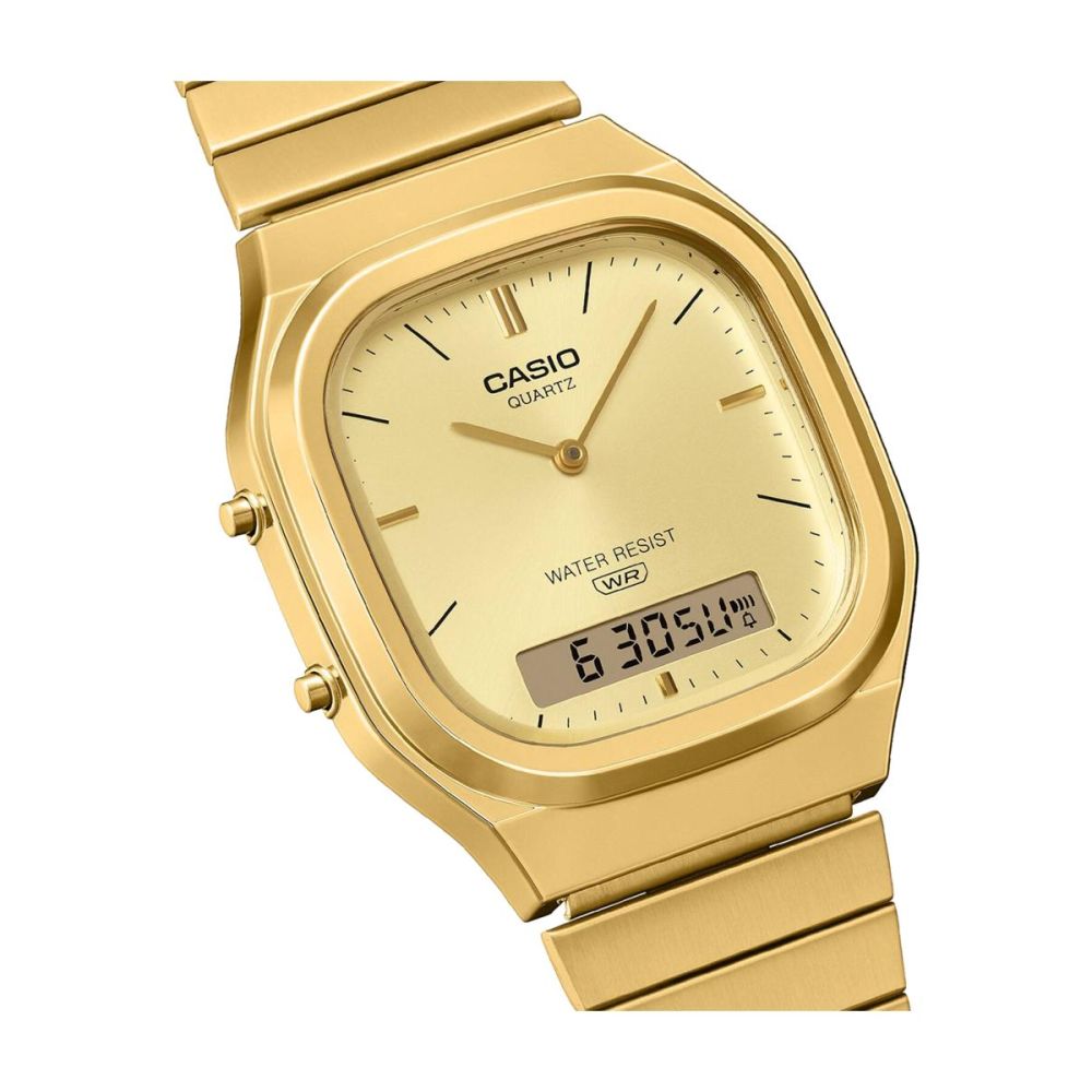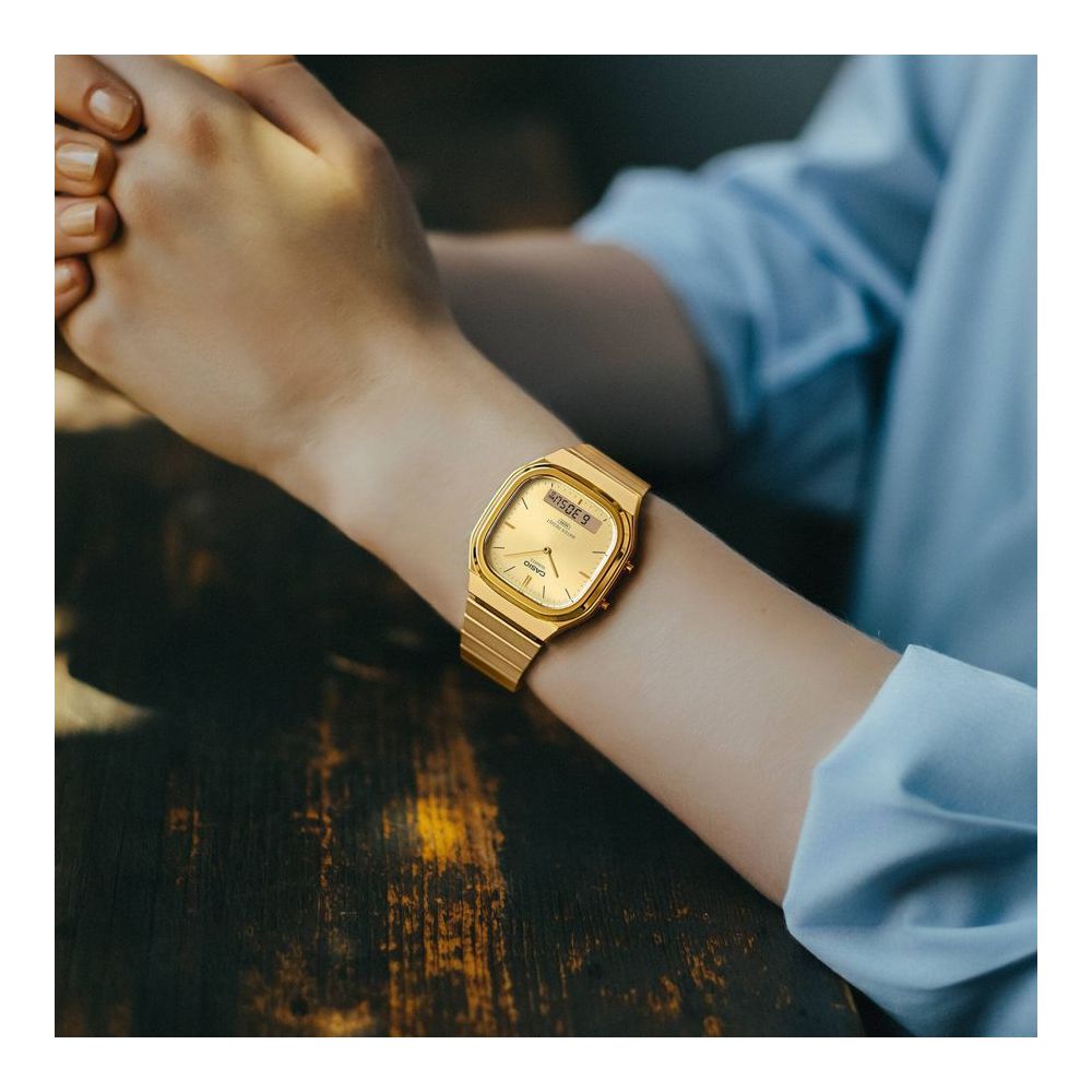 O AQ-240 analógico-digital com ecrã duplo é retro-moderno. Com um mostrador ligeiramente retangular compensado por uma caixa suavemente arredondada e curvas metálicas suaves, este relógio transpira sofisticação.