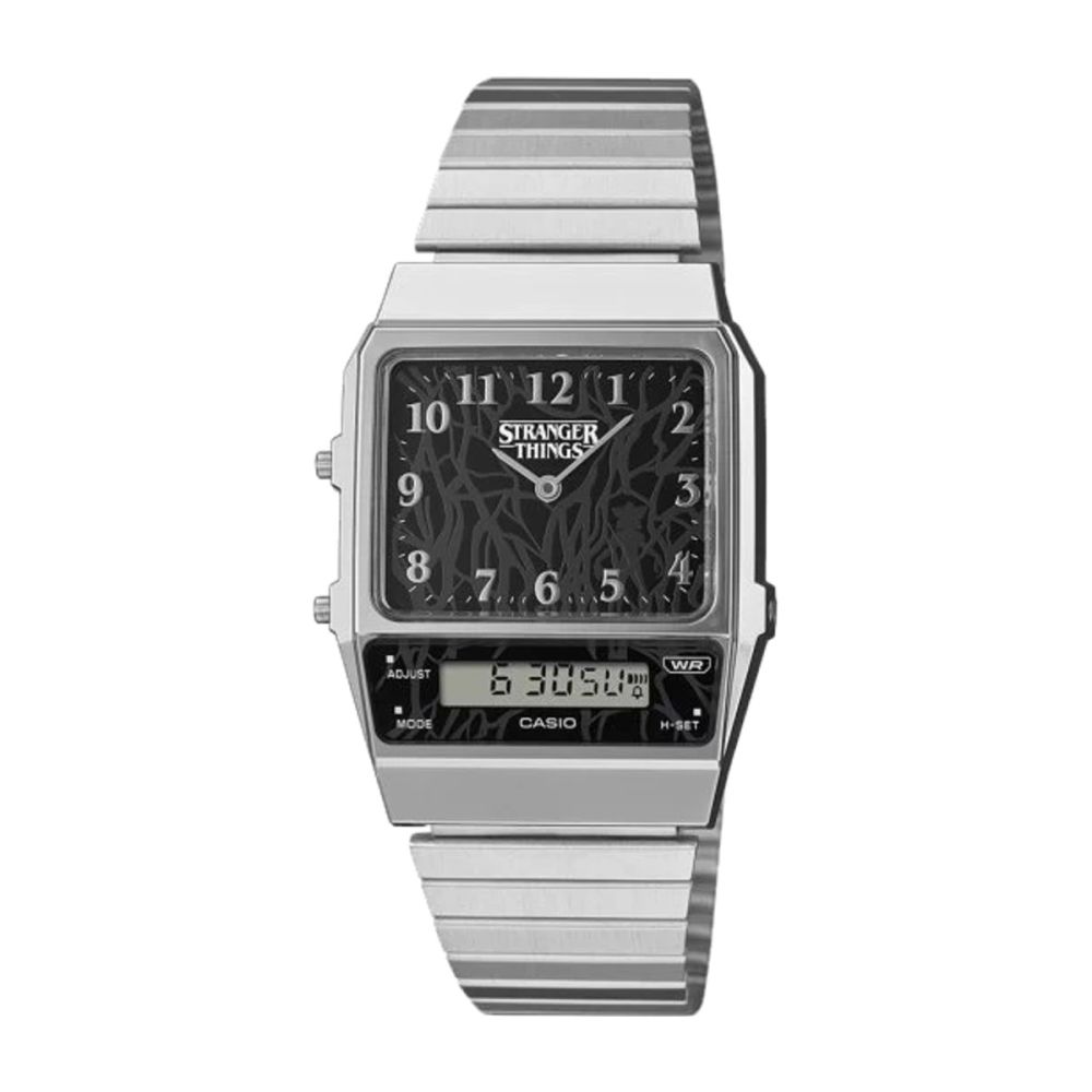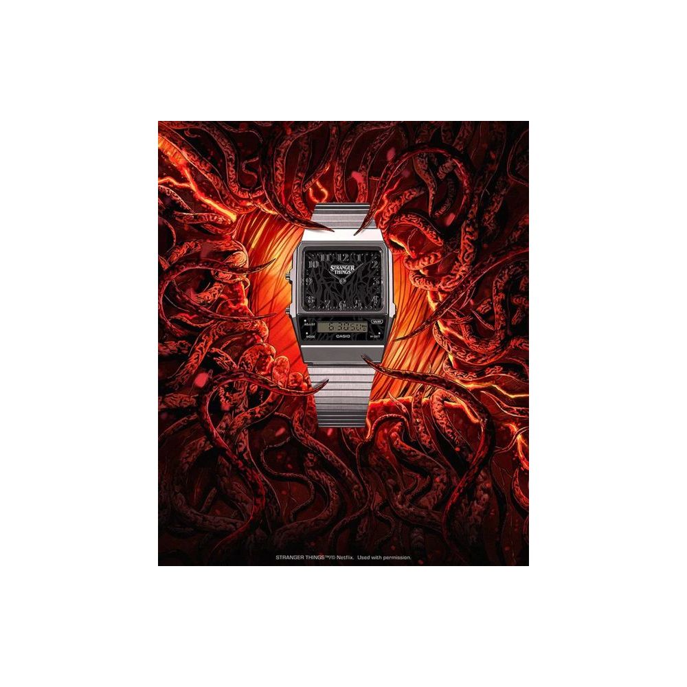Este relógio baseia-se no modelo AQ-800. Inspirado nos dois mundos da história — a realidade familiar e o universo do Upside Down —, o design incorpora elementos-chave da série em cada detalhe.