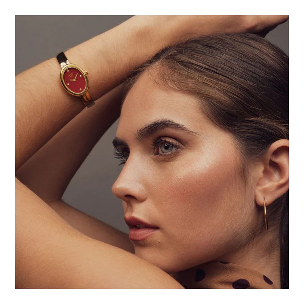 Na edição Borgonha, o mostrador contrasta com a bracelete dourada em forma de bagel e a caixa oval, acrescentando calor e uma sofisticação marcante.