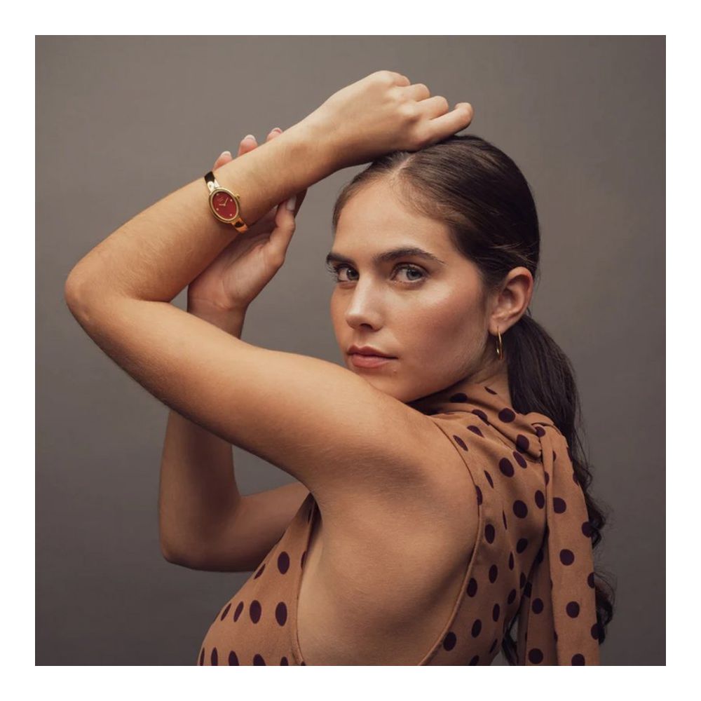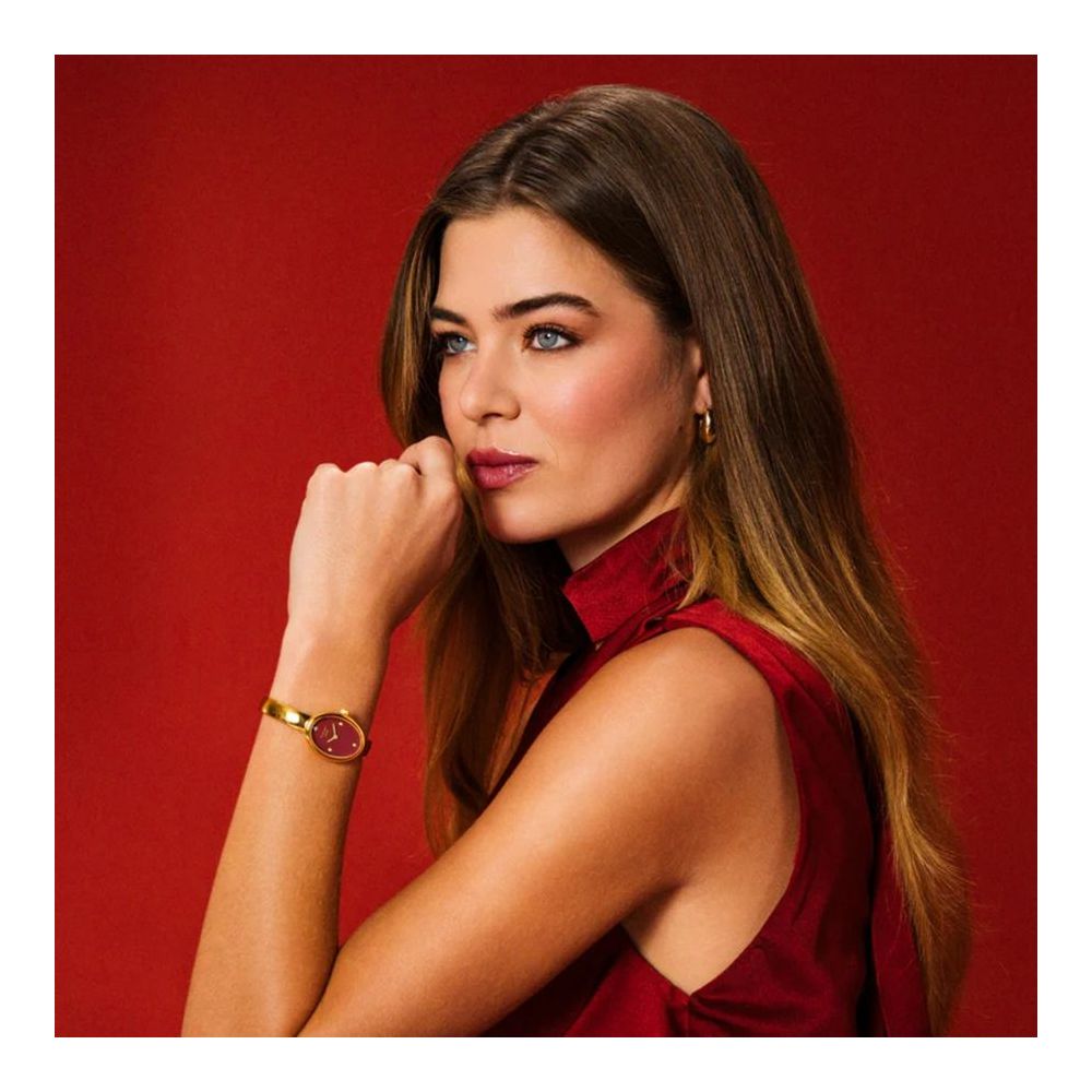 Na edição Borgonha, o mostrador contrasta com a bracelete dourada em forma de bagel e a caixa oval, acrescentando calor e uma sofisticação marcante.