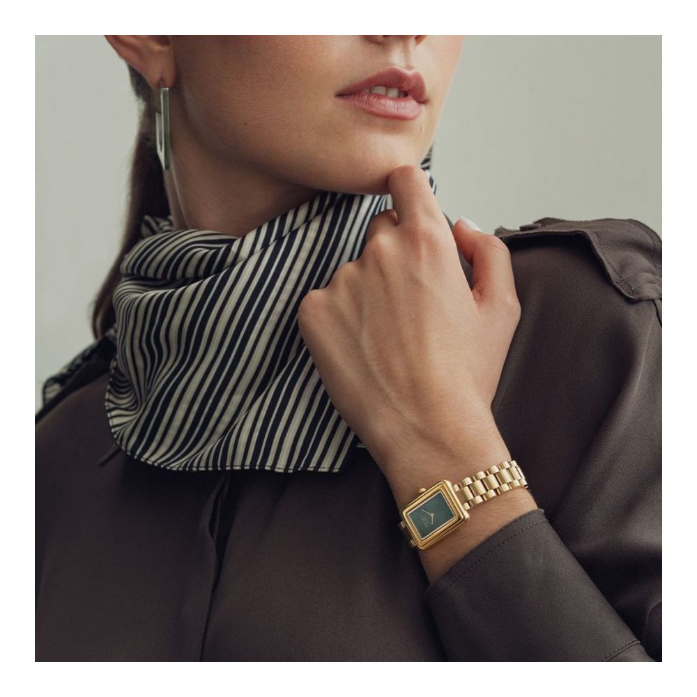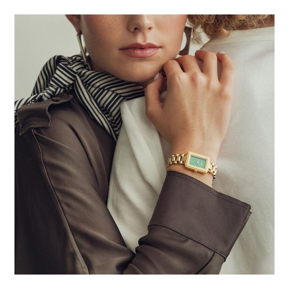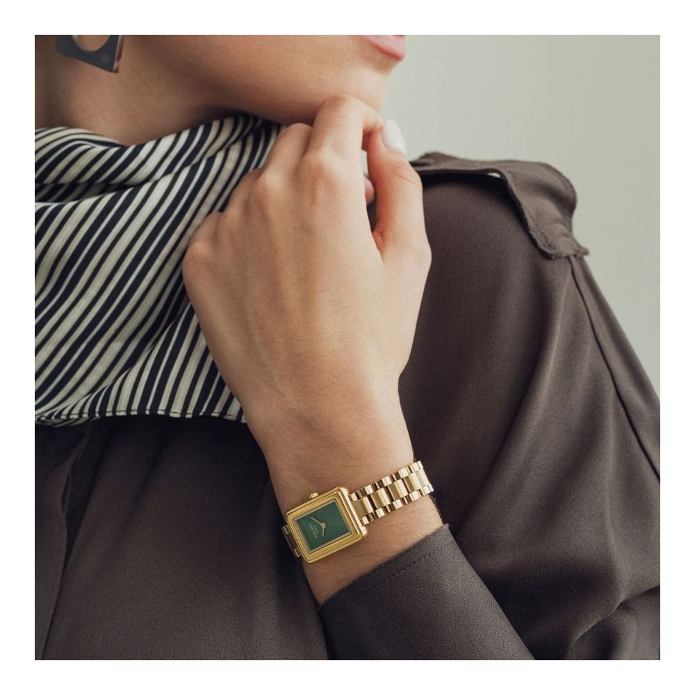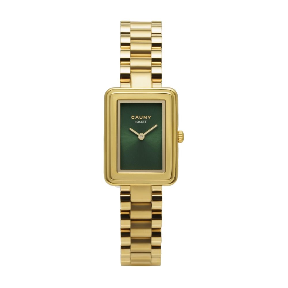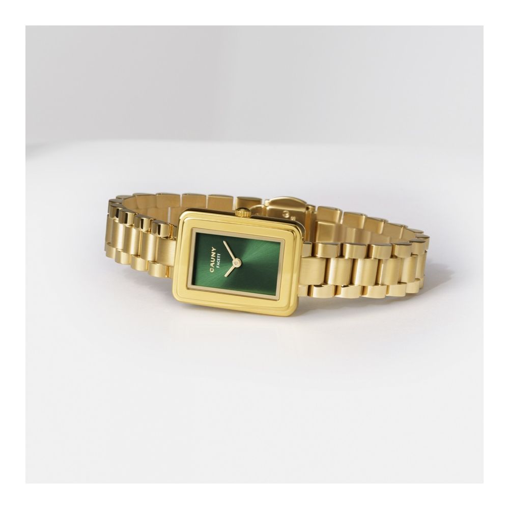 Este relógio Cauny tem uma caixa com diâmetro aproximado de 21 mm, caixa e bracelete cor dourada, mostrador cor verde. Está equipado com um movimento de quartzo. O relógio é estanque até 30 m | 3 bar | 3 atm. Composição: aço.