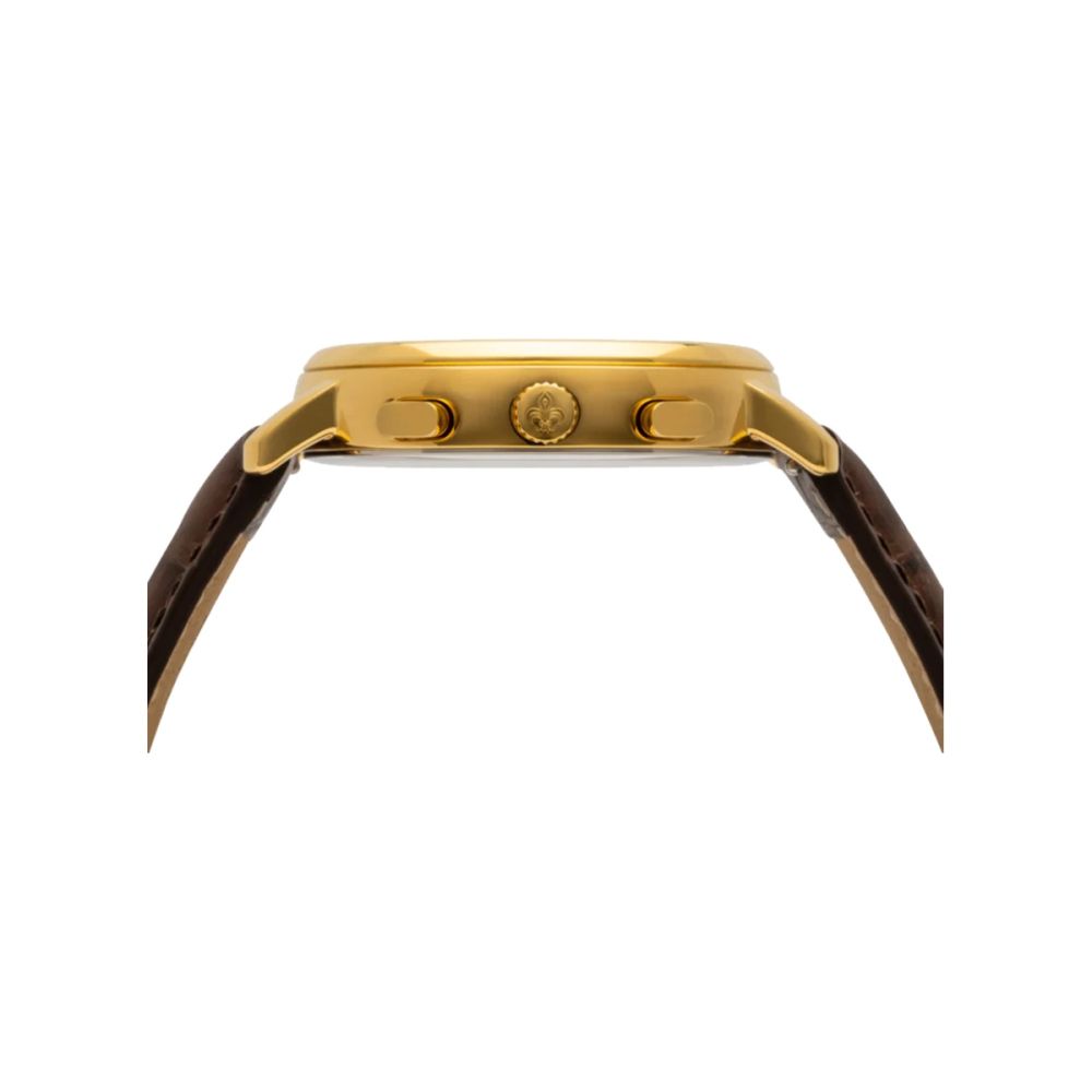 Este relógio Cauny tem uma caixa com diâmetro aproximado de 41 mm, caixa cor dourado, bracelete cor castanha, mostrador cor branca. Está equipado com um movimento de quartzo. O relógio é estanque até 50m | 5 bar | 5 atm. Composição: aço e couro/pele (couro italiano genuino).
