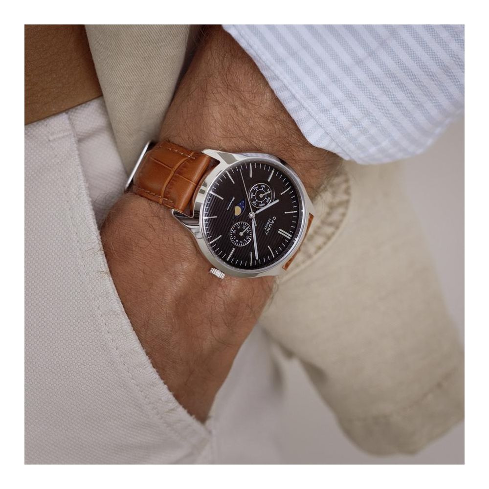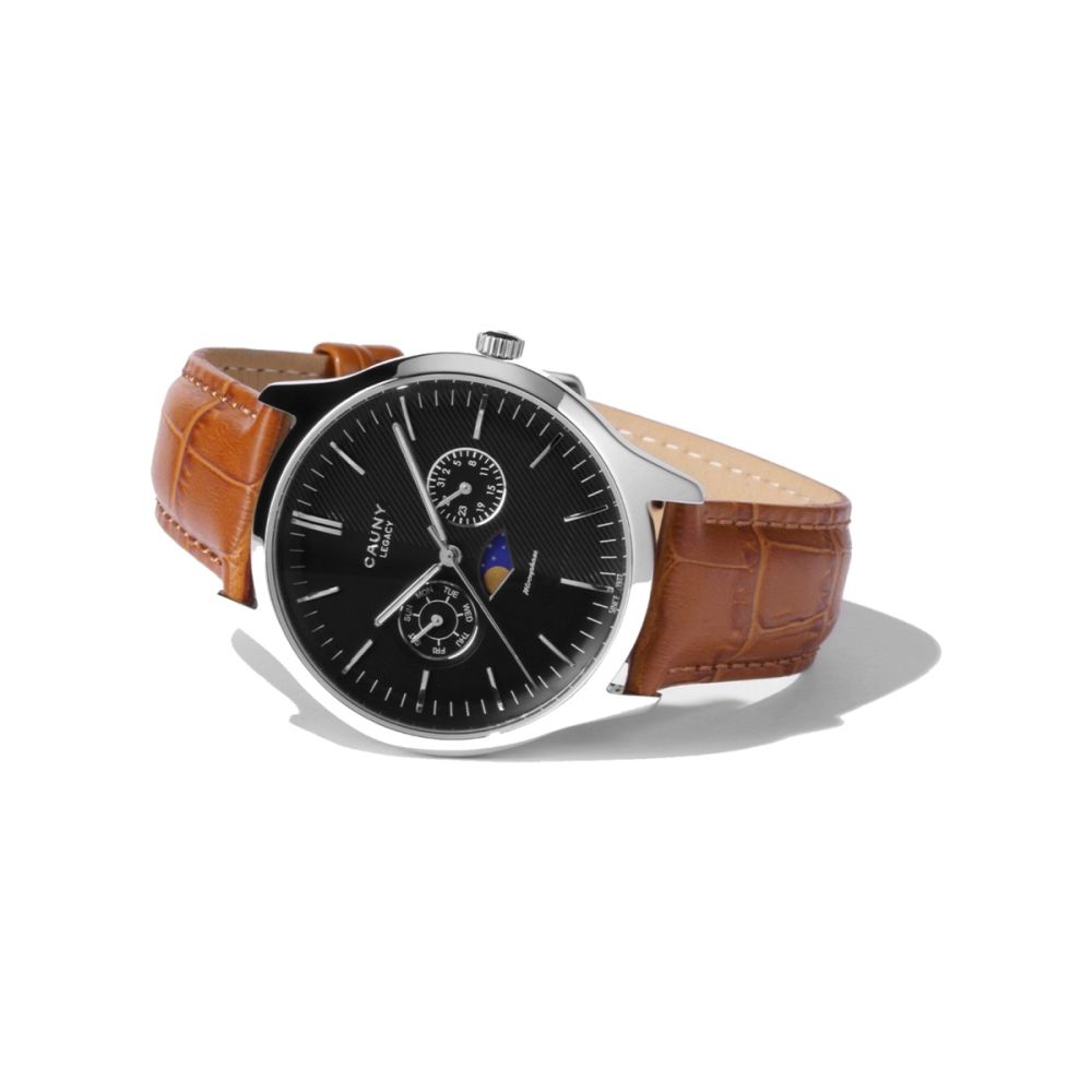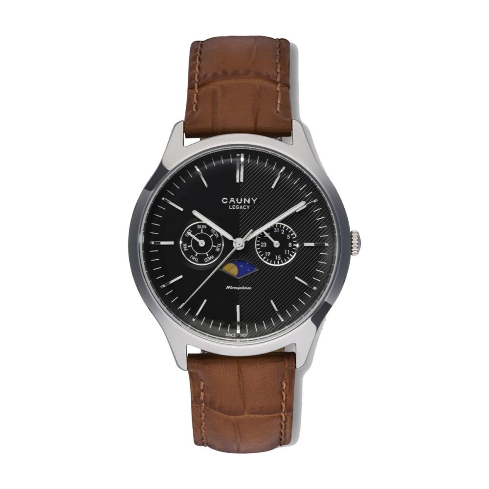 O Legacy é uma interpretação contemporânea da antiga tradição relojoeira de mostrar o movimento lunar. Com uma caixa em aço 316L de alta precisão, um mostrador preto com um acabamento duplo complexo e uma elegante bracelete castanha, este relógio é uma opção discreta que combina detalhes requintados com um visual sóbrio.