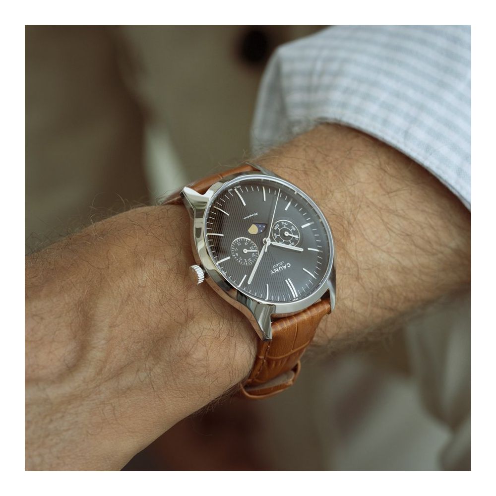 Este relógio Cauny tem uma caixa com diâmetro aproximado de 41 mm, cor prateado e bracelete cor castanha. Está equipado com um movimento de quartzo. O relógio é estanque até 50 m | 5 bar | 5 atm. Composição: aço e couro/pele.