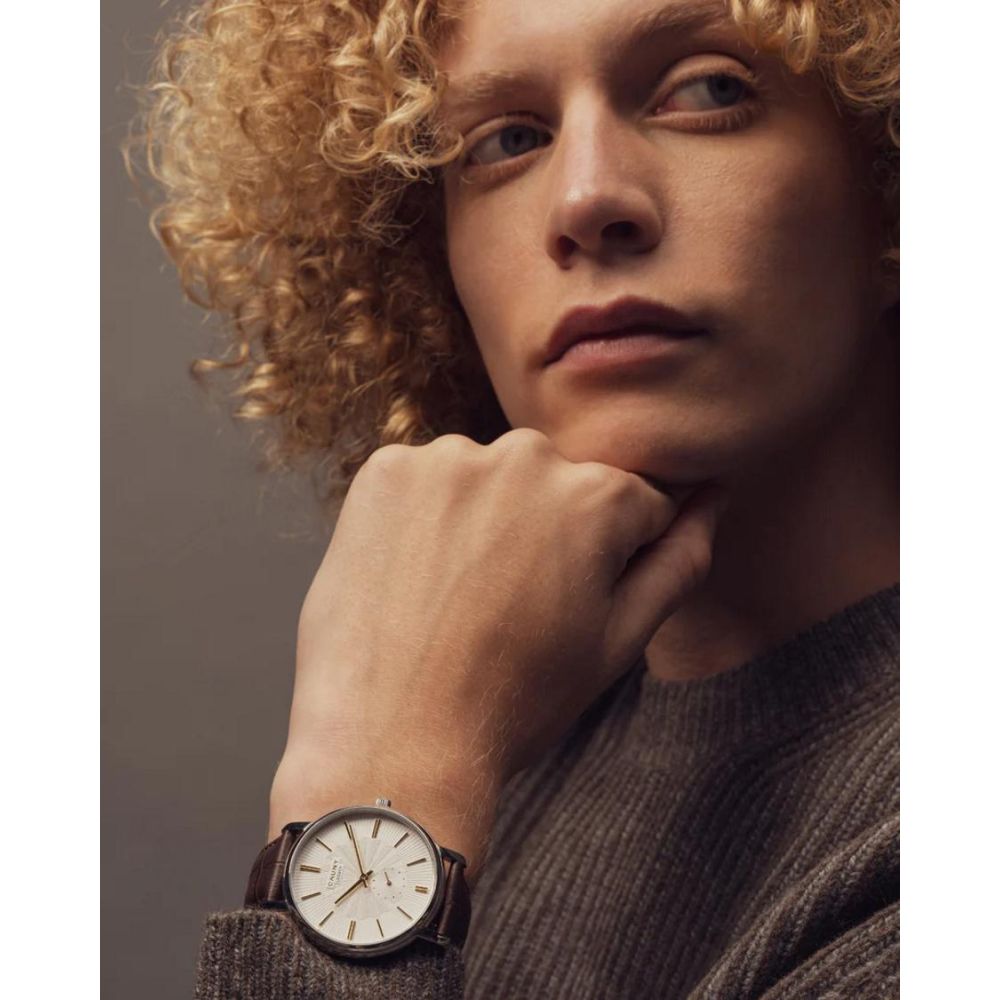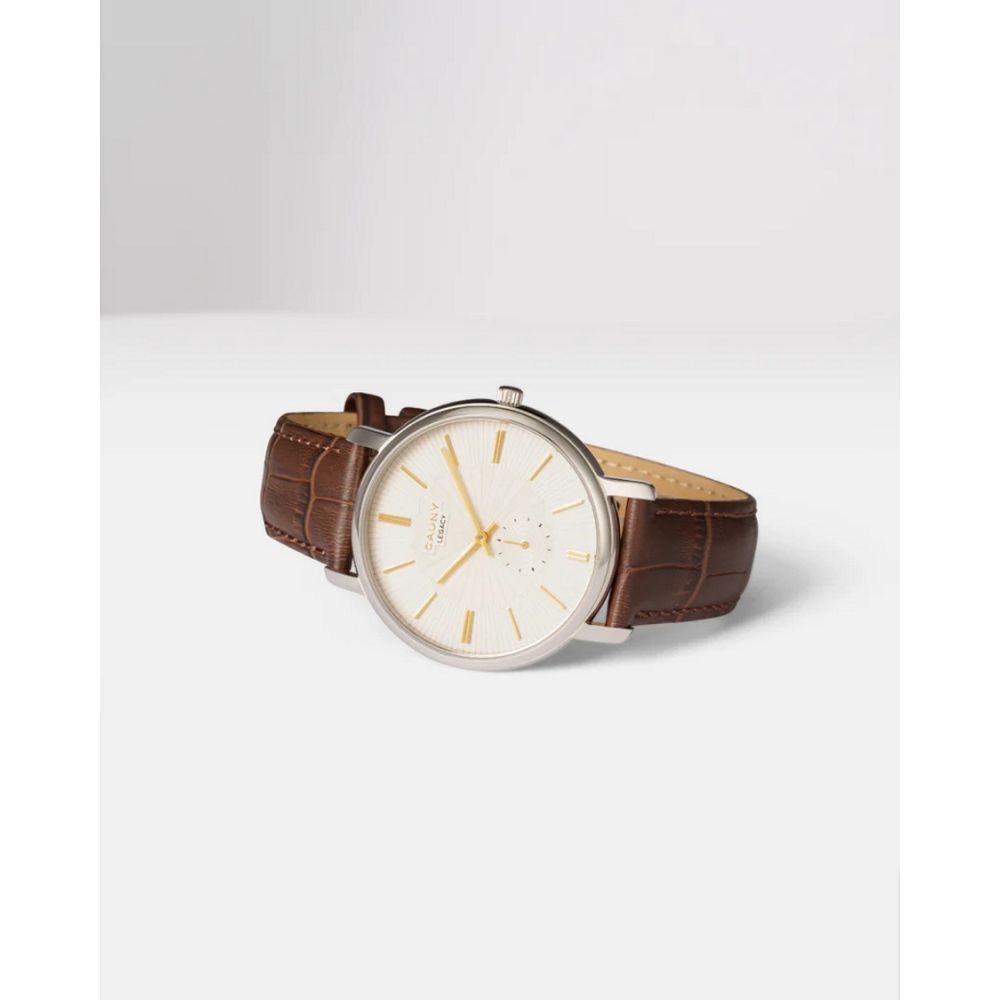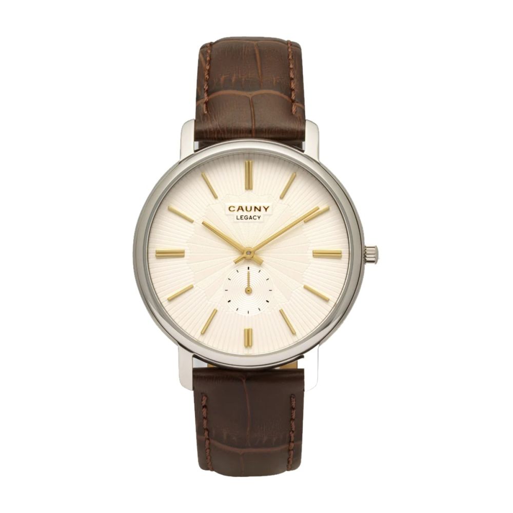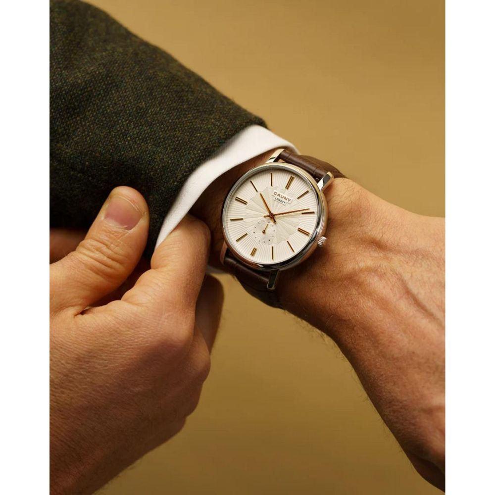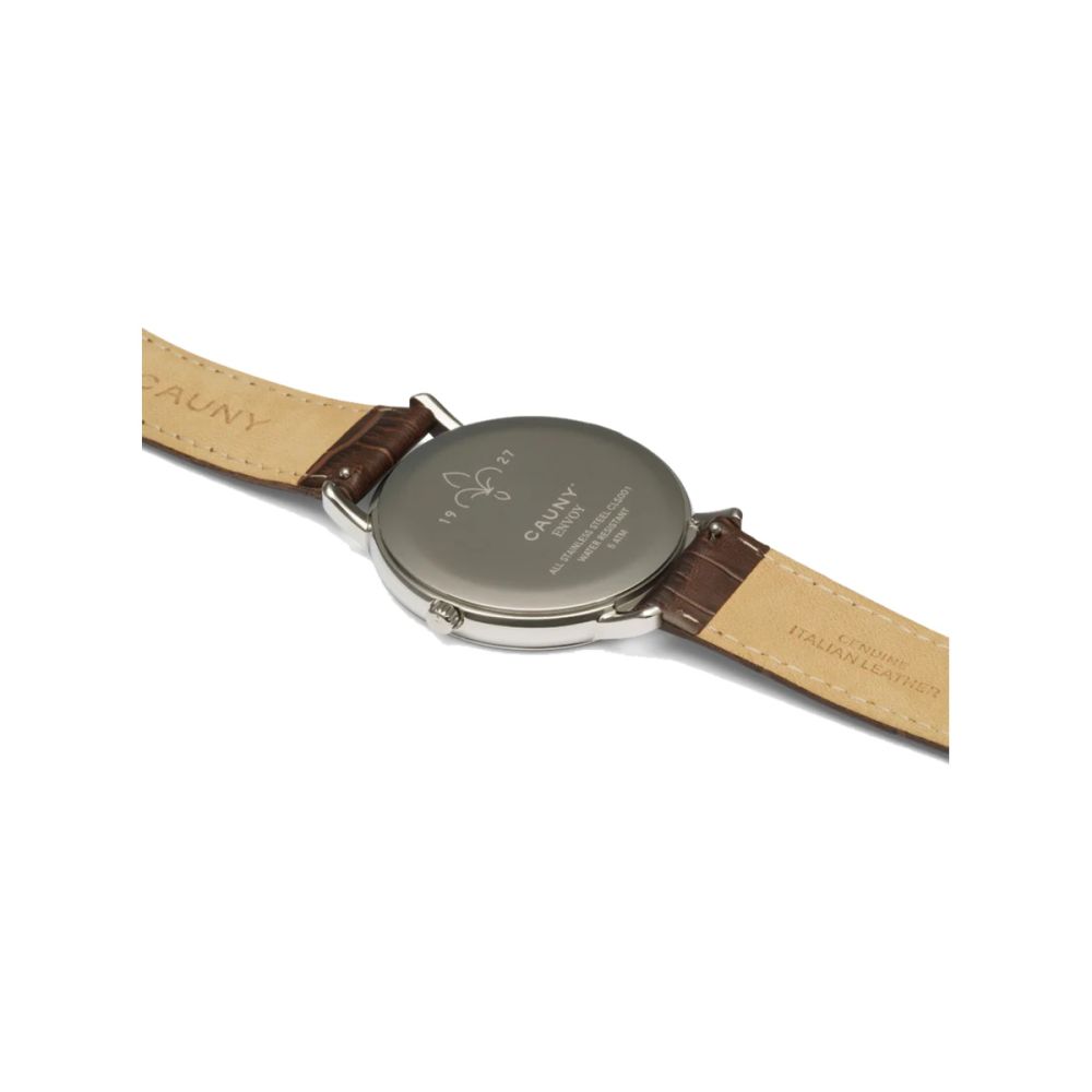 Este relógio Cauny tem uma caixa com diâmetro aproximado de 42 mm, caixa cor prateada, bracelete cor castanha, mostrador cor branca. Está equipado com um movimento de quartzo. O relógio é estanque até 50m | 5 bar | 5 atm. Composição: aço e couro/pele (couro italiano genuino).