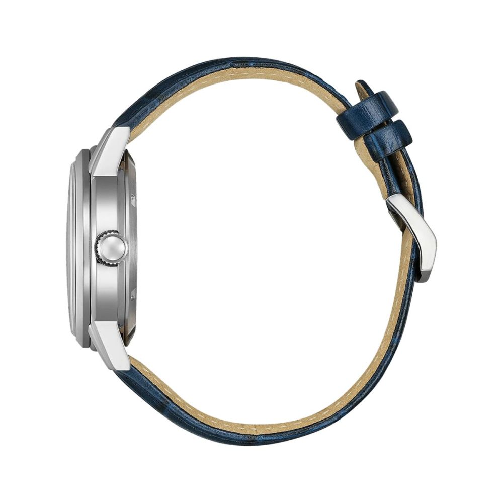 Caixa com diâmetro aproximado de 40 mm, mostrador cor azul, bracelete cor azul e caixa cor prateada. Está equipado com um movimento eco-drive. O relógio é estanque até 50 m | 5 bar | 5 atm. Composição: aço e couro/pele.