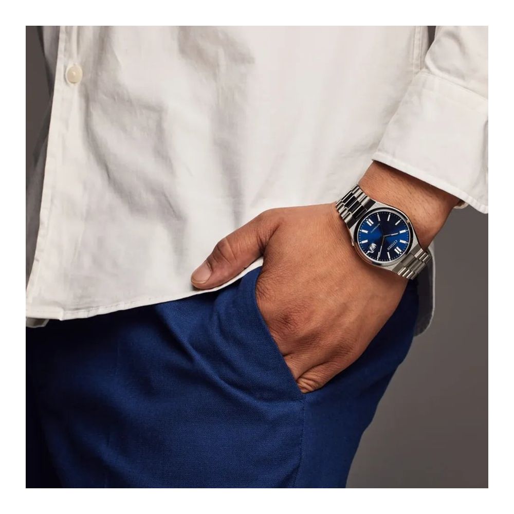Caixa com diâmetro aproximado de 37 mm, mostrador cor azul escuro e bracelete e caixa cor prateada. Está equipado com um movimento automático. O relógio é estanque até 50 m | 5 bar | 5 atm. Composição: aço, safira.