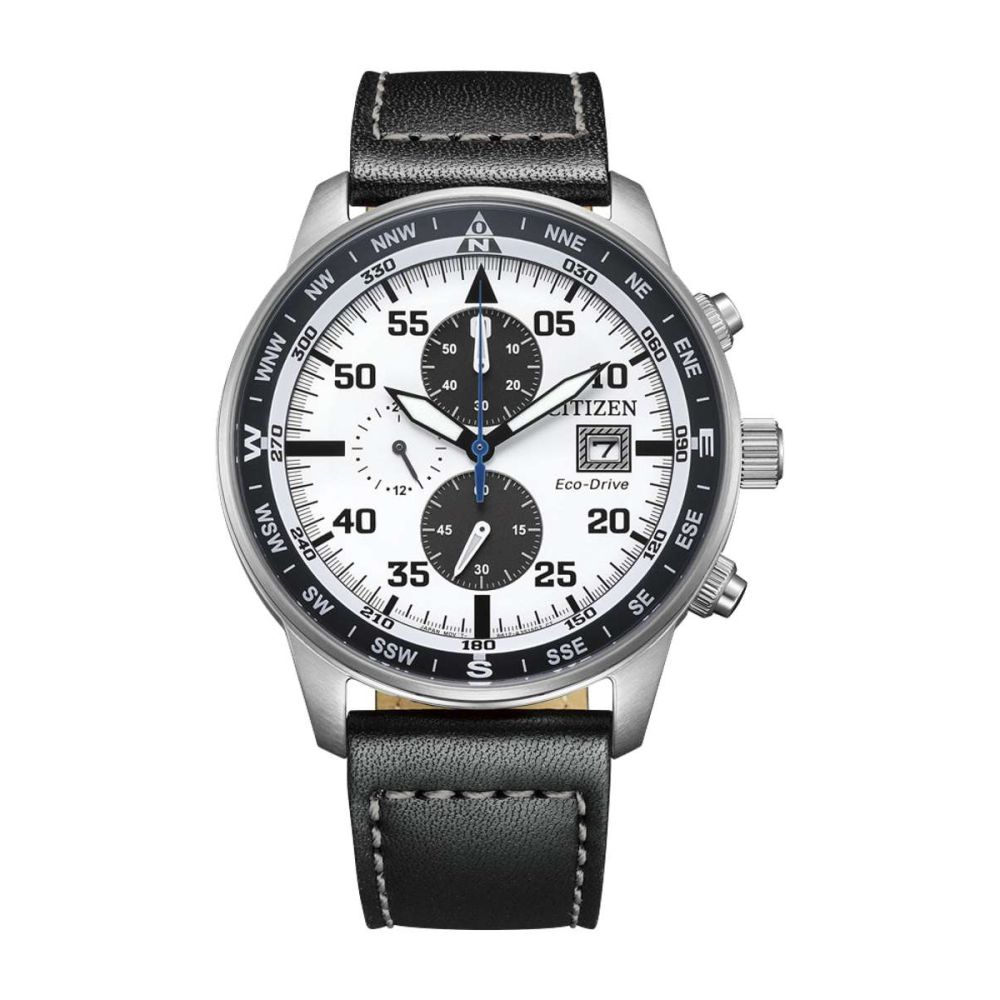 Caixa com diâmetro aproximado de 44 mm, mostrador cor branco, bracelete cor preta e caixa cor prateada. Está equipado com um movimento eco-drive. O relógio é estanque até 100 m | 10 bar | 10 atm. Composição: aço e couro/pele.