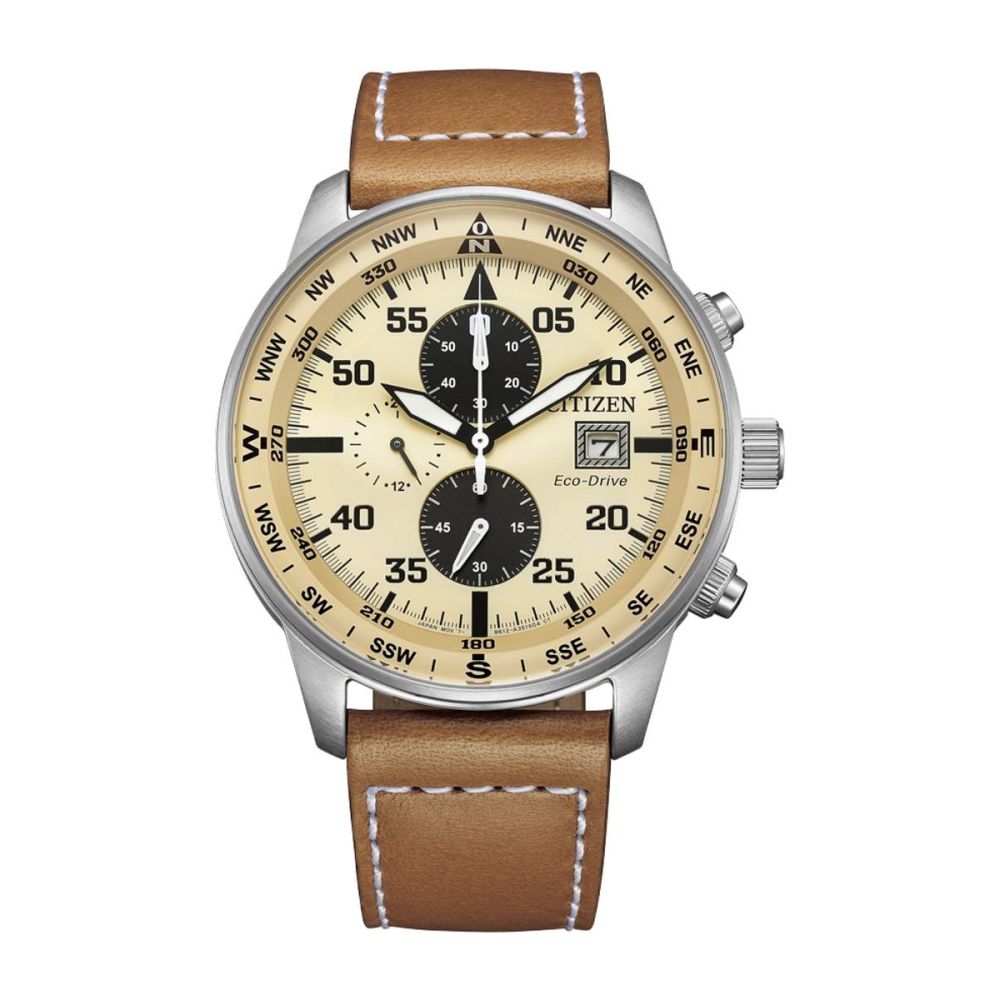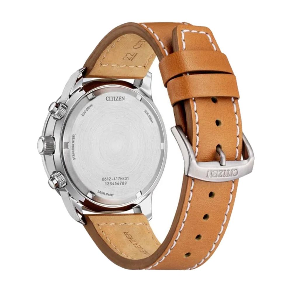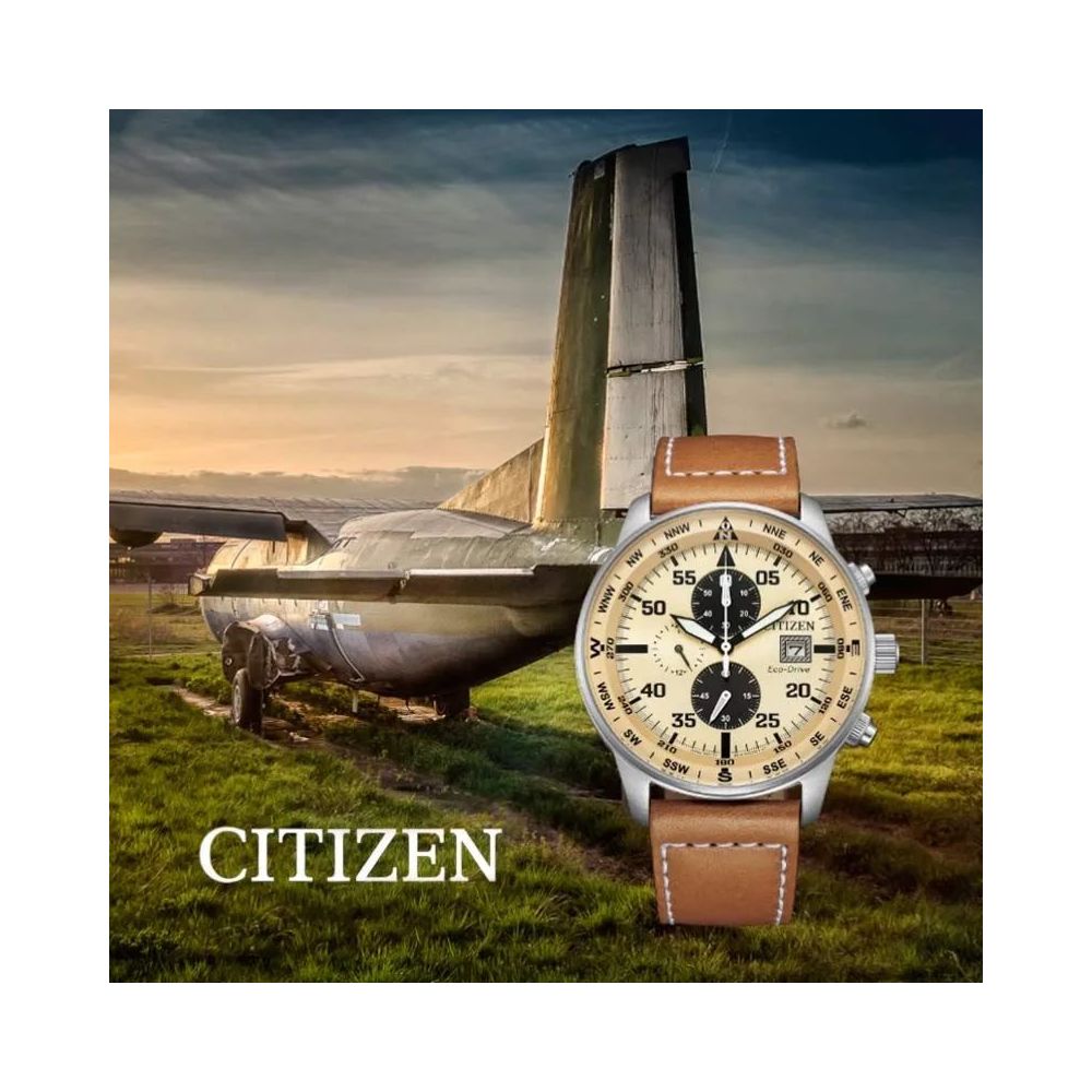 Caixa com diâmetro aproximado de 44 mm, mostrador cor bege, bracelete cor castanha e caixa cor prateada. Está equipado com um movimento eco-drive. O relógio é estanque até 100 m | 10 bar | 10 atm. Composição: aço e couro/pele.