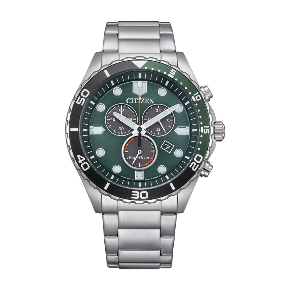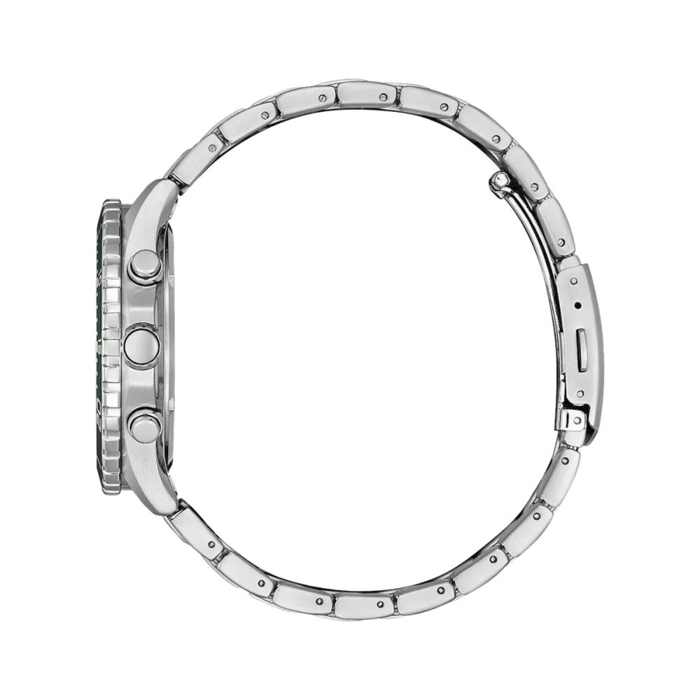 Caixa com diâmetro aproximado de 43 mm, mostrador cor verde, bracelete e caixa cor prateada. Está equipado com um movimento eco-drive. O relógio é estanque até 100 m | 10 bar | 10 atm. Composição: aço.