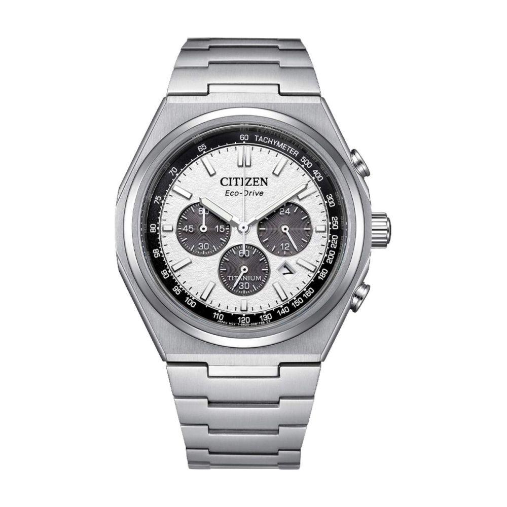 Caixa com diâmetro aproximado de 43 mm, mostrador cor branco, bracelete e caixa cor prateada. Está equipado com um movimento eco-drive. O relógio é estanque até 100 m | 10 bar | 10 atm. Composição: Super Titanium, safira.