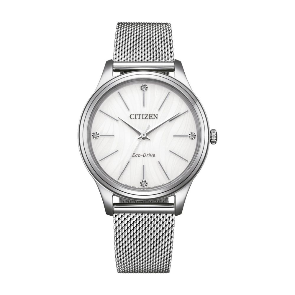 Caixa com diâmetro aproximado de 34 mm, mostrador cor branca, bracelete cor prateadae caixa cor prateada. Está equipado com um movimento eco-drive. O relógio é estanque até 50 m | 5 bar | 5 atm. Composição: aço.