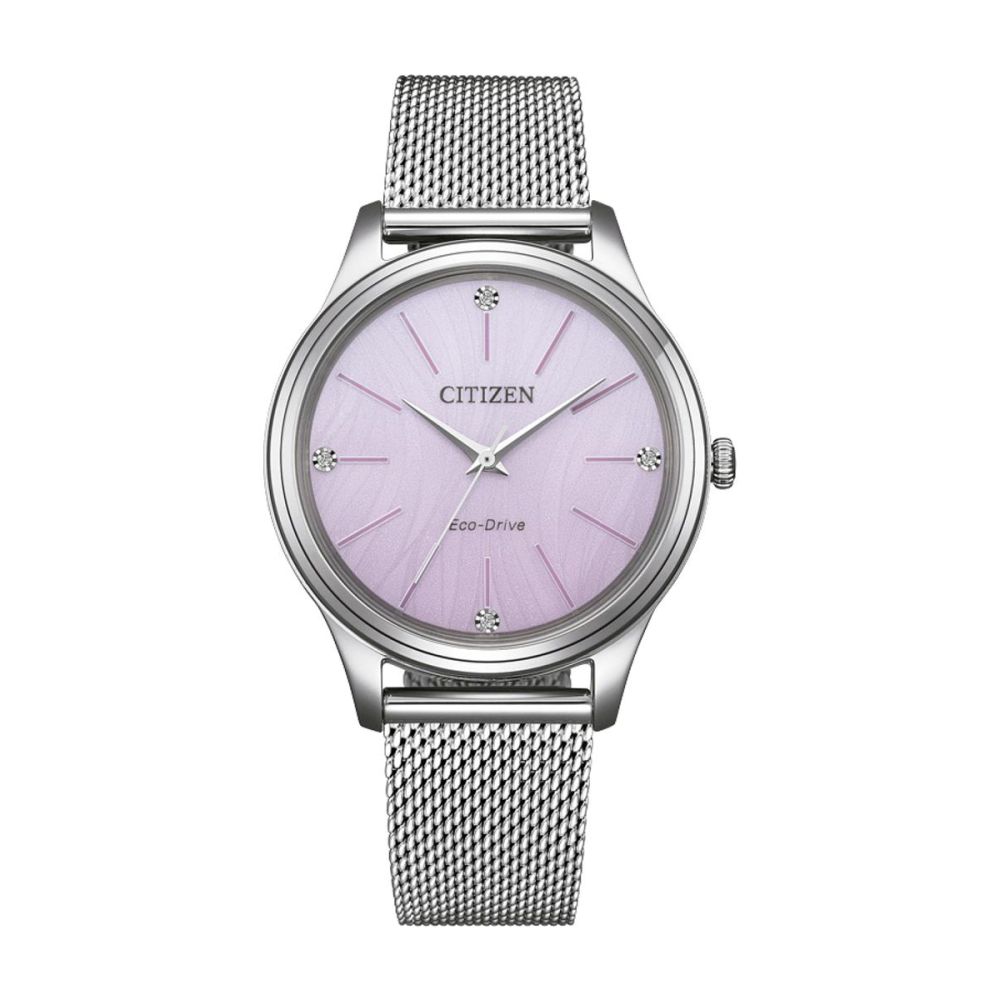 Caixa com diâmetro aproximado de 34 mm, mostrador cor-de-rosa, bracelete cor prateada e caixa cor prateada. Está equipado com um movimento eco-drive. O relógio é estanque até 50 m | 5 bar | 5 atm. Composição: aço.
