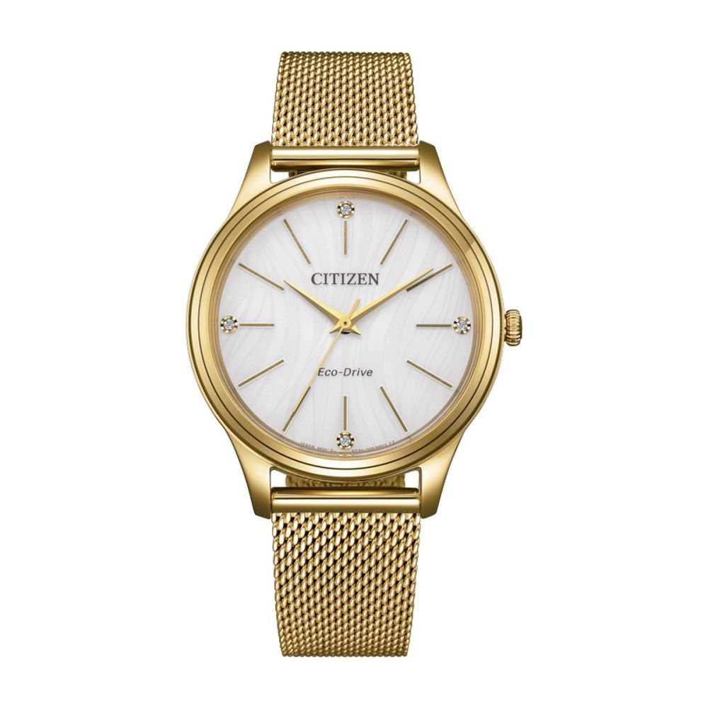 Caixa com diâmetro aproximado de 34 mm, mostrador branco, bracelete cor dourada e caixa cor dourada. Está equipado com um movimento eco-drive. O relógio é estanque até 50 m | 5 bar | 5 atm. Composição: aço.