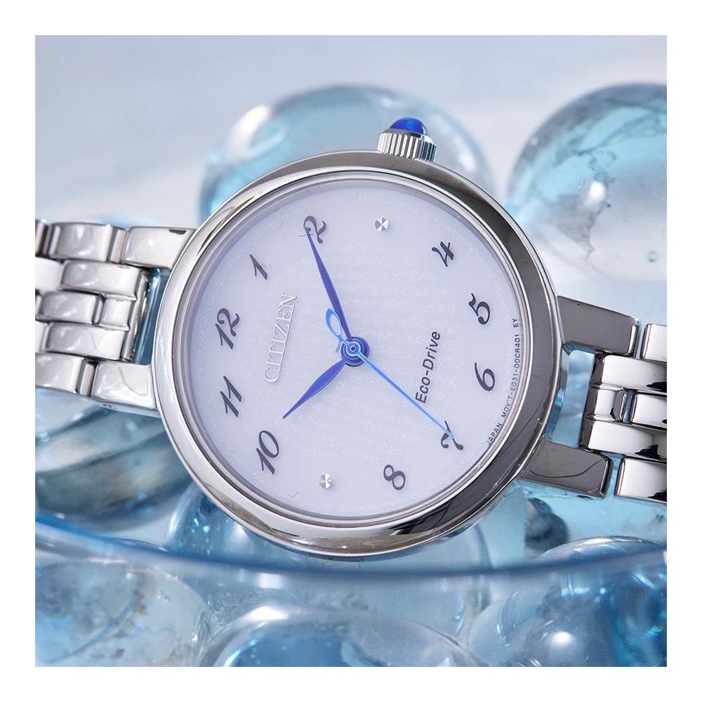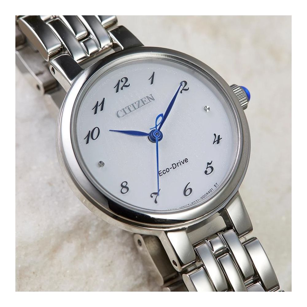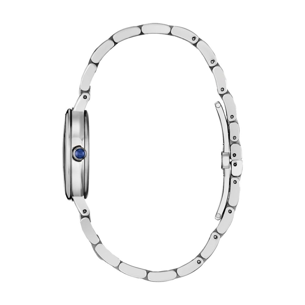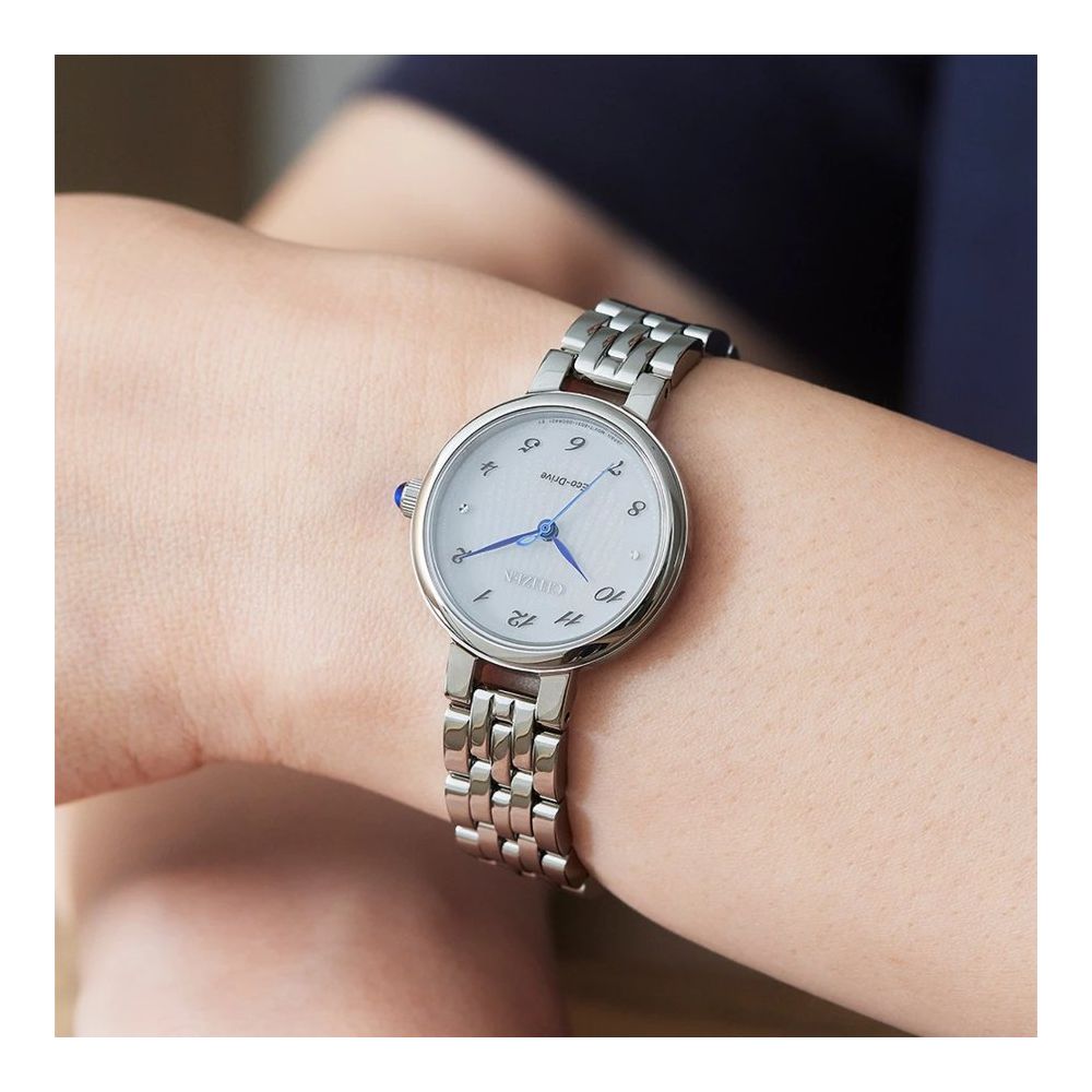 Caixa com diâmetro aproximado de 27 mm, mostrador cor madrepérola e bracelete e caixa cor prateada. Está equipado com um movimento eco-drive. O relógio é estanque até 50 m | 5 bar | 5 atm. Composição: aço, safira.