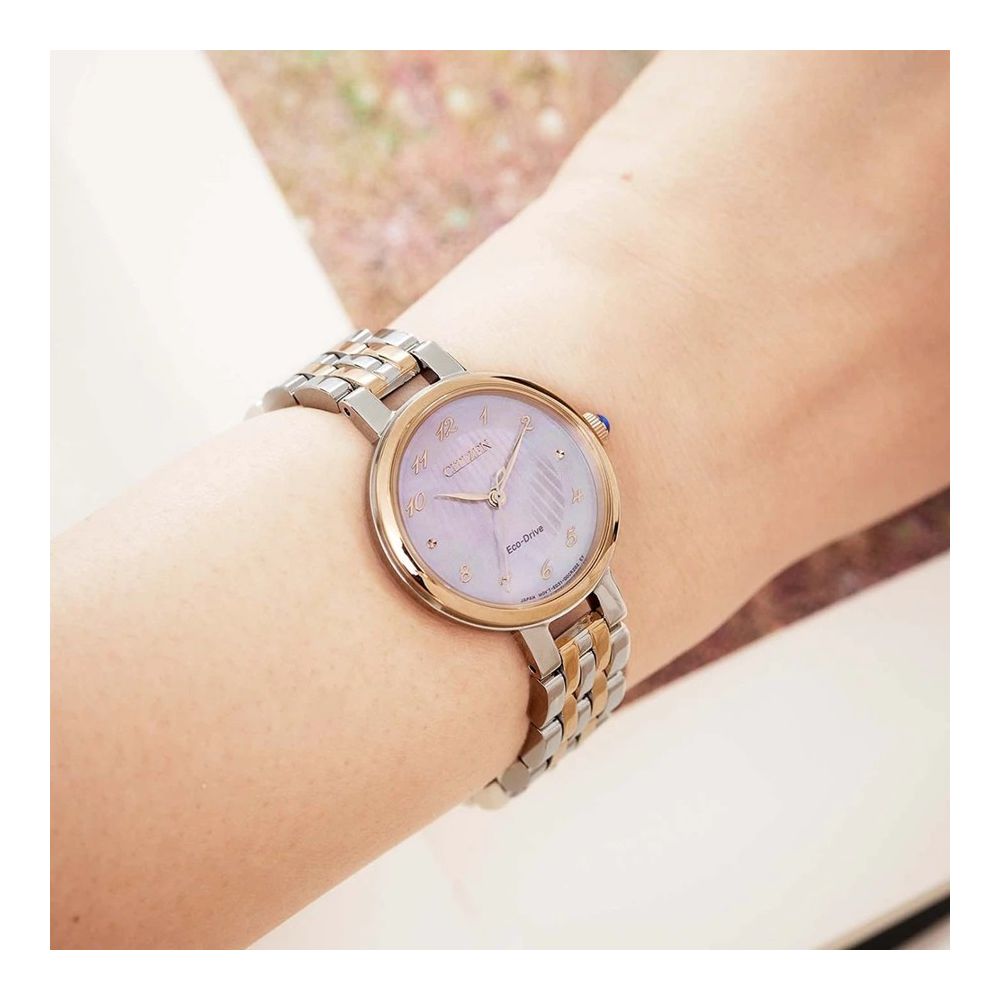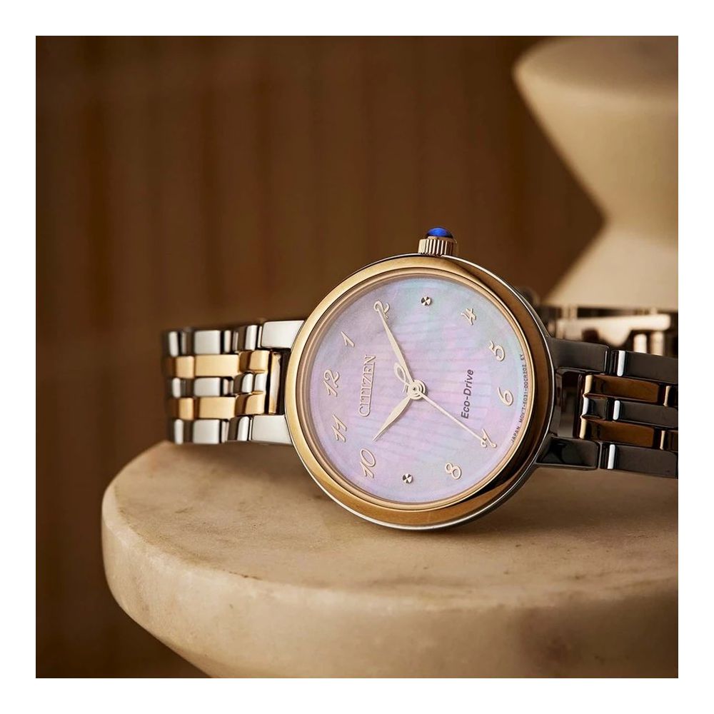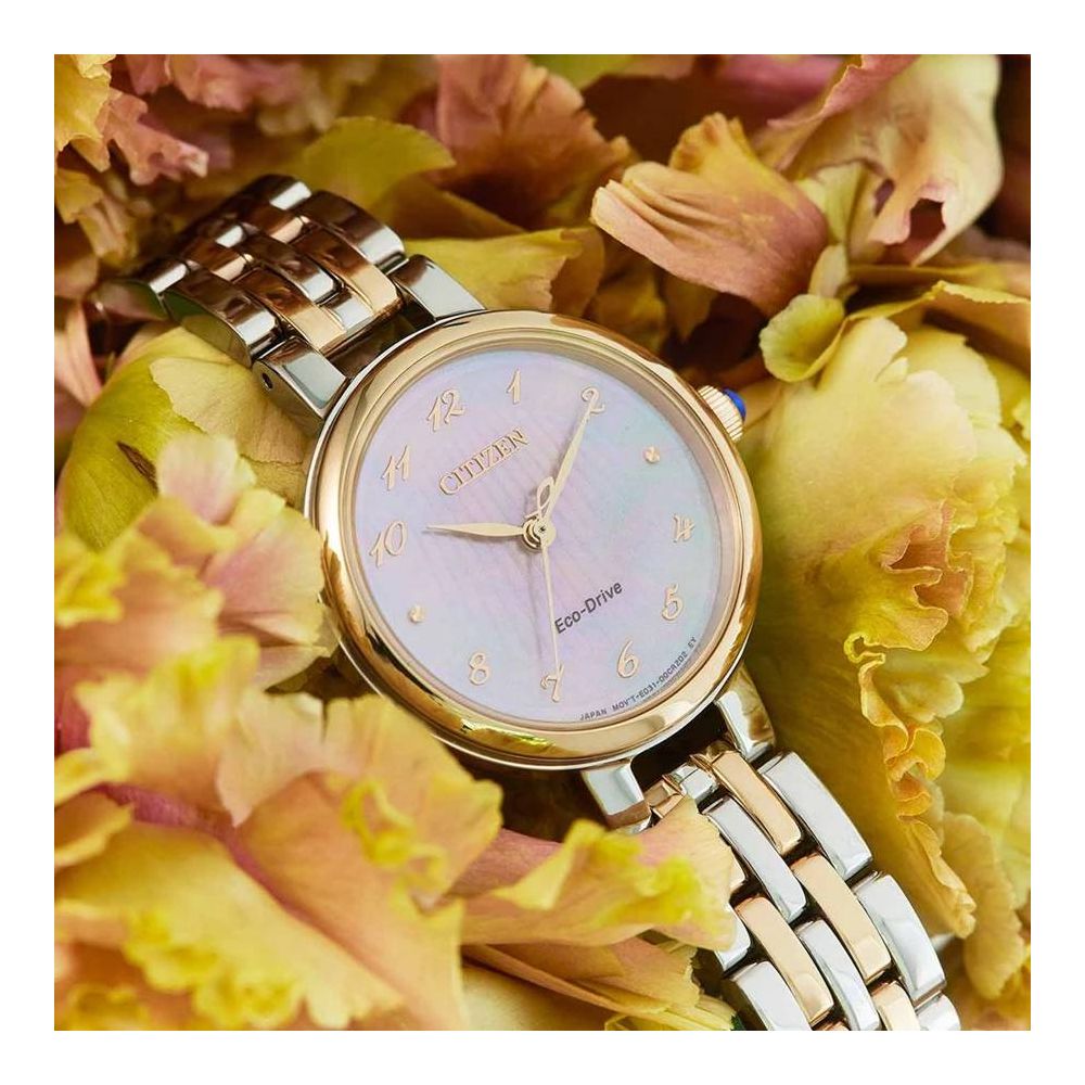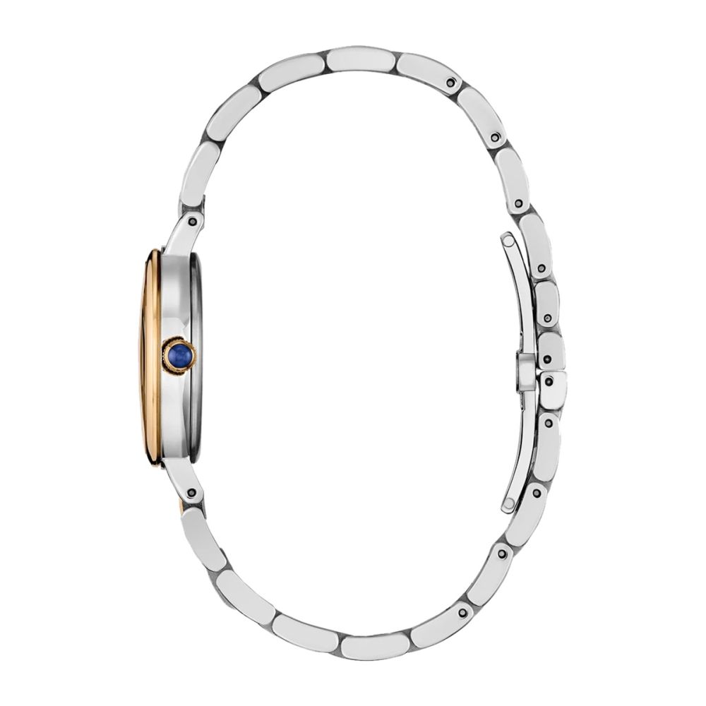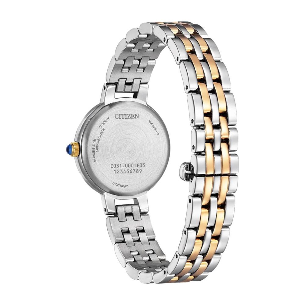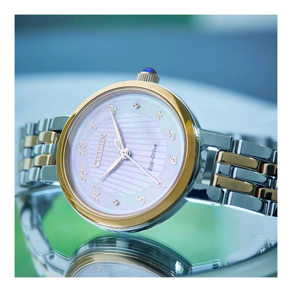Caixa com diâmetro aproximado de 27 mm, mostrador cor madrepérola e bracelete e caixa cor prateada e dourada. Está equipado com um movimento eco-drive. O relógio é estanque até 50 m | 5 bar | 5 atm. Composição: aço, safira.