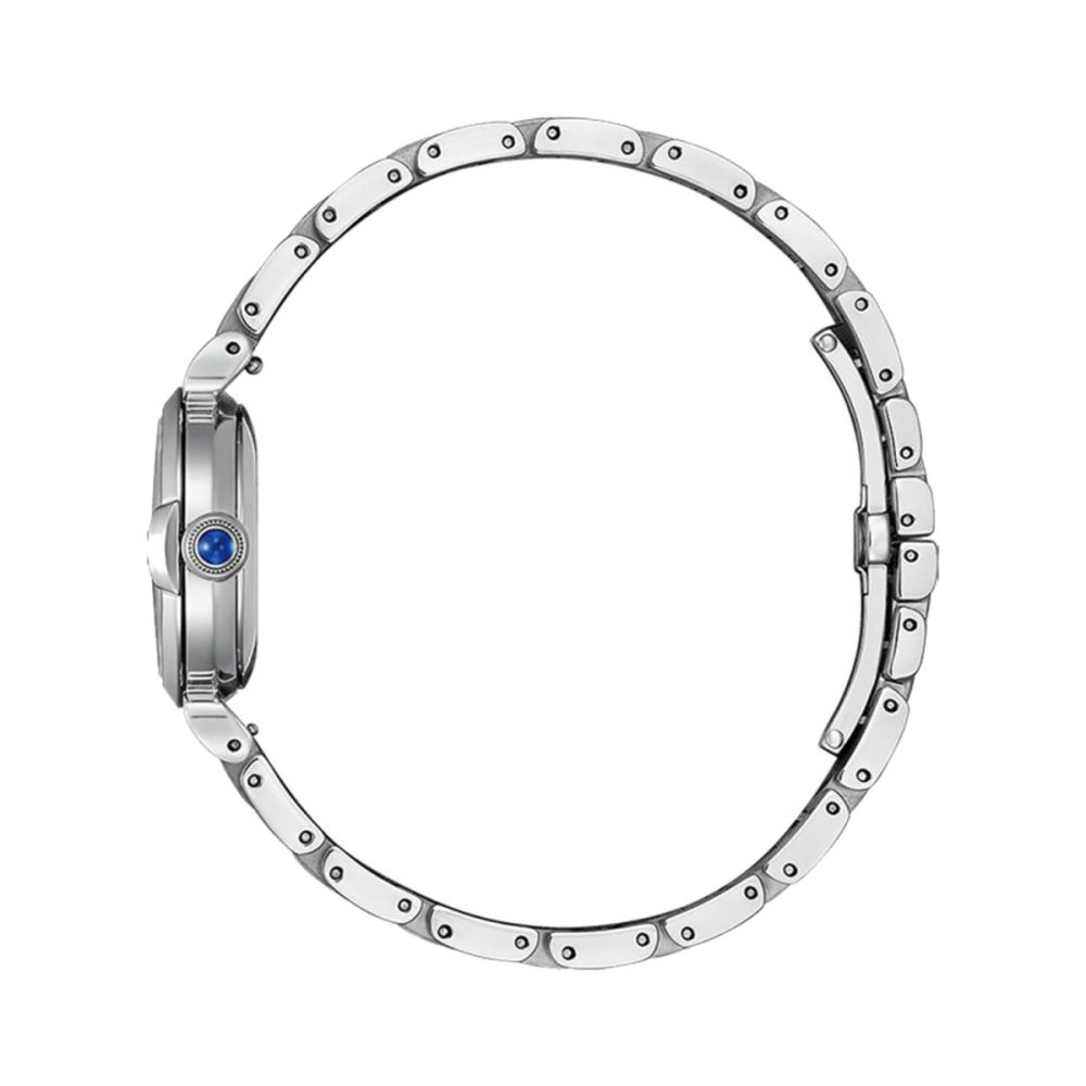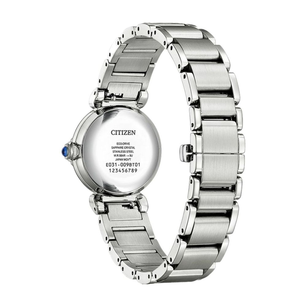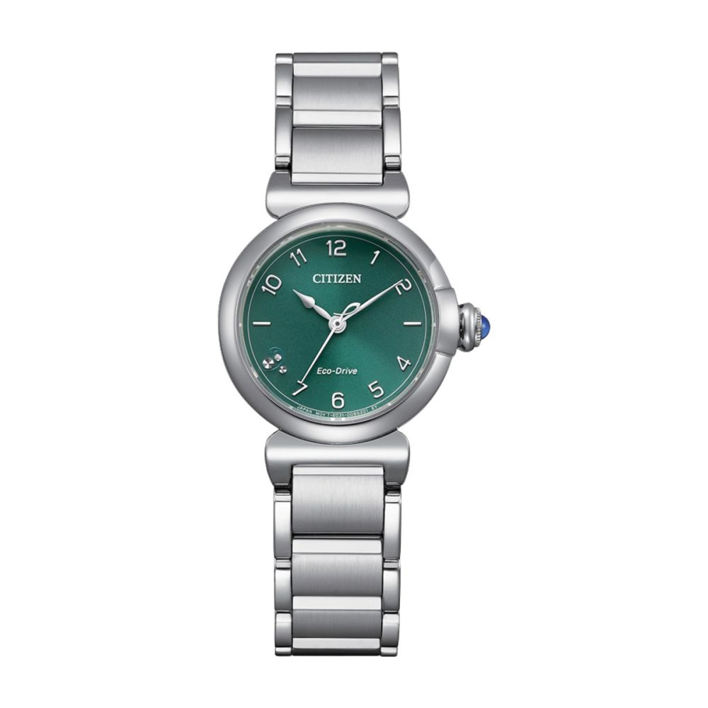 Caixa com diâmetro aproximado de 26 mm, mostrador cor verde, bracelete e caixa cor prateada. Está equipado com um movimento eco drive. O relógio é estanque até 50 m | 5 bar | 5 atm. Composição: Aço e safira.