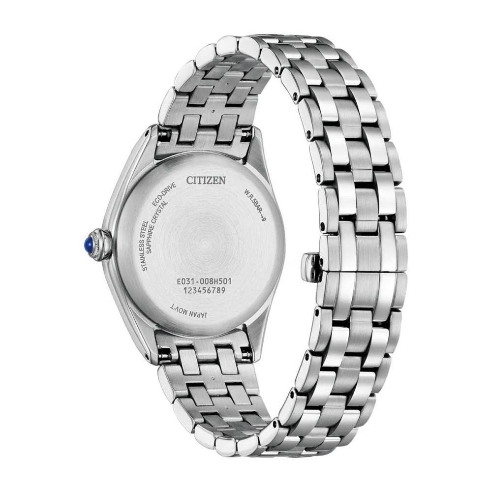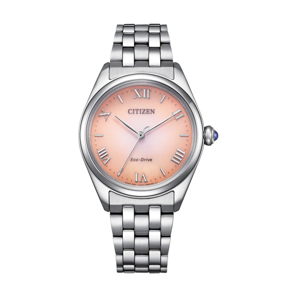 Caixa com diâmetro aproximado de 33 mm, mostrador cor rosa, bracelete e caixa cor prateada. Está equipado com um movimento eco drive. O relógio é estanque até 50 m | 5 bar | 5 atm. Composição: Aço e safira.
