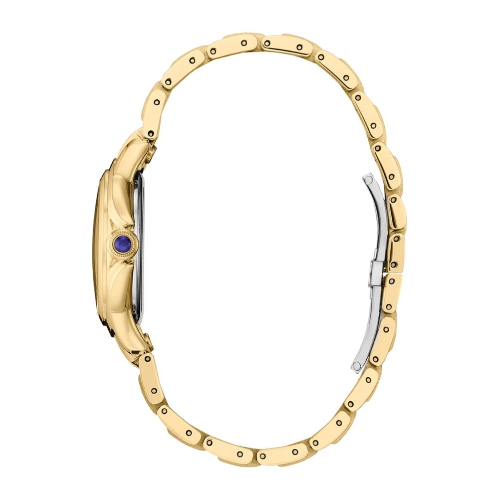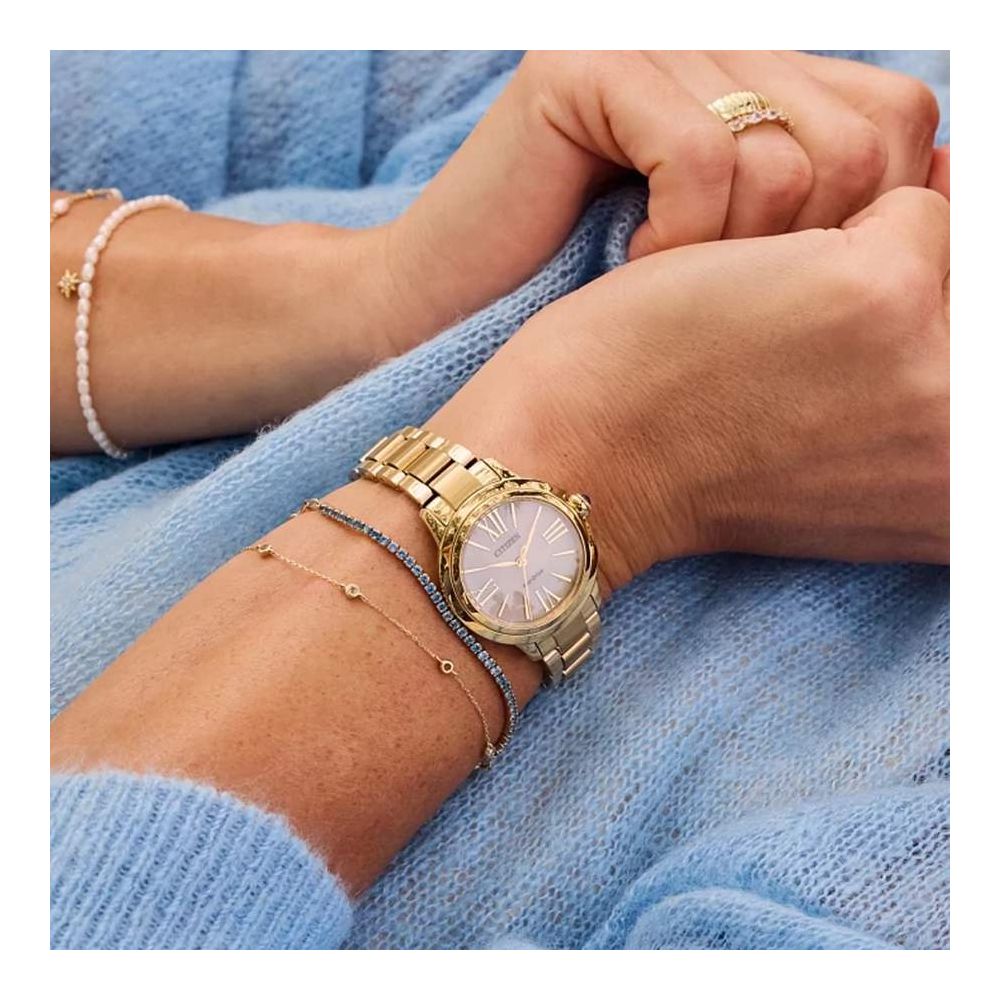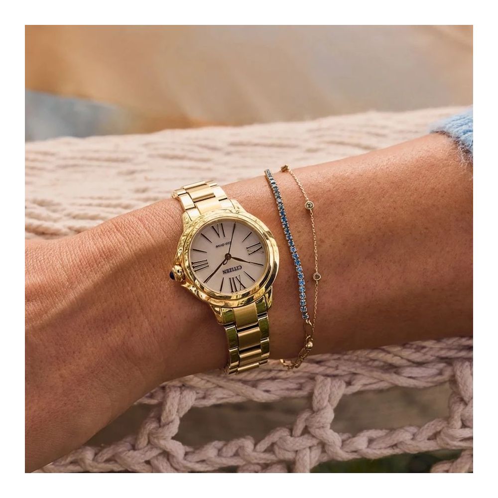 Caixa com diâmetro aproximado de 31 mm, mostrador cor branca e bracelete e caixa cor dourada. Está equipado com um movimento eco-drive. O relógio é estanque até 50 m | 5 bar | 5 atm. Composição: aço, safira.
