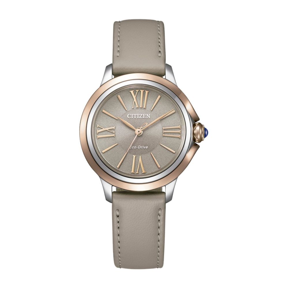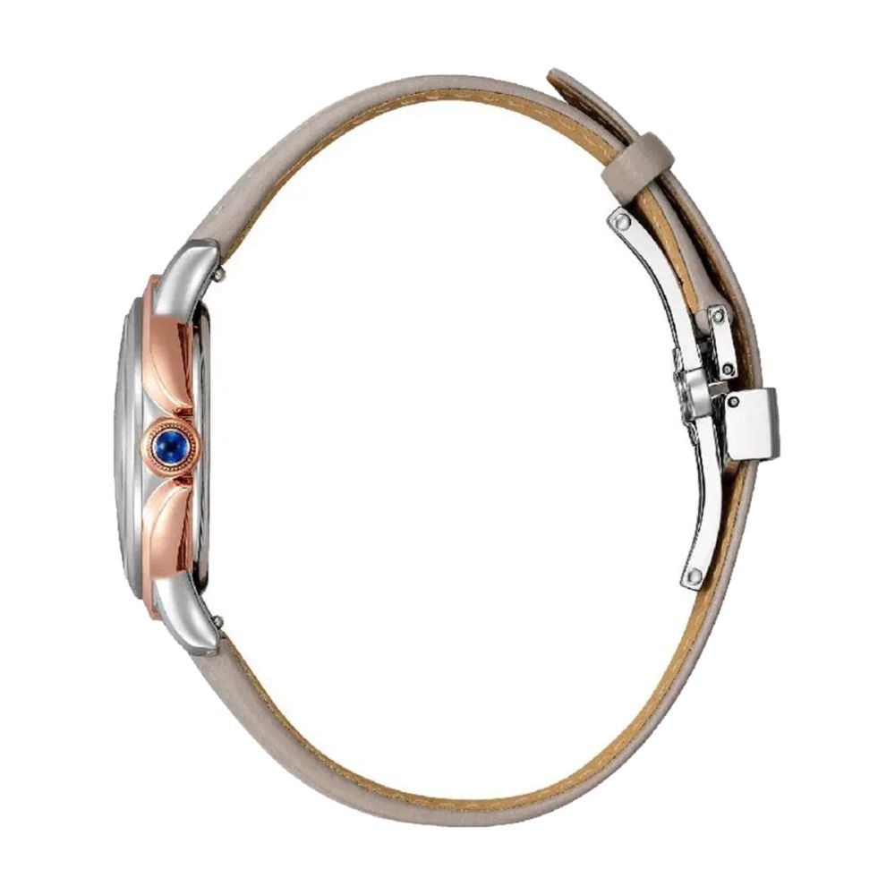 Caixa com diâmetro aproximado de 31 mm, mostrador cor bege e bracelete cor bege e caixa cor dourada rosa e prateada. Está equipado com um movimento eco-drive. O relógio é estanque até 50 m | 5 bar | 5 atm. Composição: aço, safira e couro/pele.