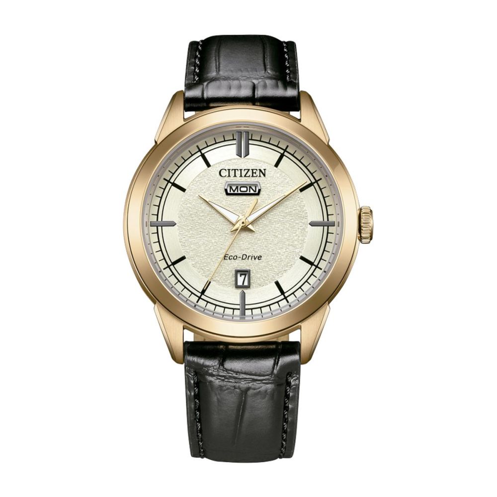 Caixa com diâmetro aproximado de 41 mm, mostrador cor dourado e bracelete cor preta e caixa cor dourado. Está equipado com um movimento eco-drive. O relógio é estanque até 100 m | 10 bar | 10 atm. Composição: aço e couro/pele.