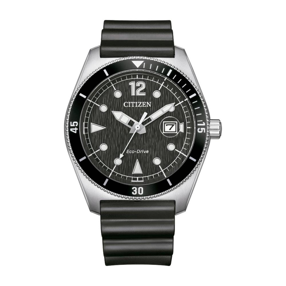 Caixa com diâmetro aproximado de 43 mm, mostrador cor preto e bracelete cor preto e caixa cor prateado. Está equipado com um movimento eco-drive. O relógio é estanque até 100 m | 10 bar | 10 atm. Composição: aço e poliuretano.