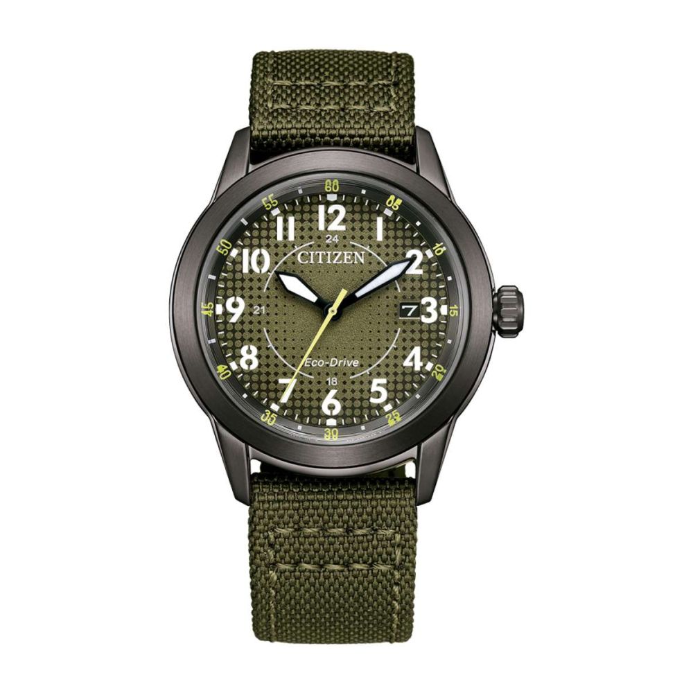 Caixa com diâmetro aproximado de 40 mm, mostrador e bracelete verde e caixa cor preta. Está equipado com um movimento eco-drive. O relógio é estanque até 100 m | 10 bar | 10 atm. Composição: aço e nylon.