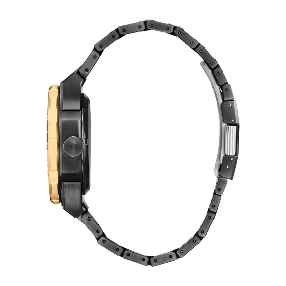 Bisel bidirecional em aço dourado com “click feeling” e anel de registo black + white.