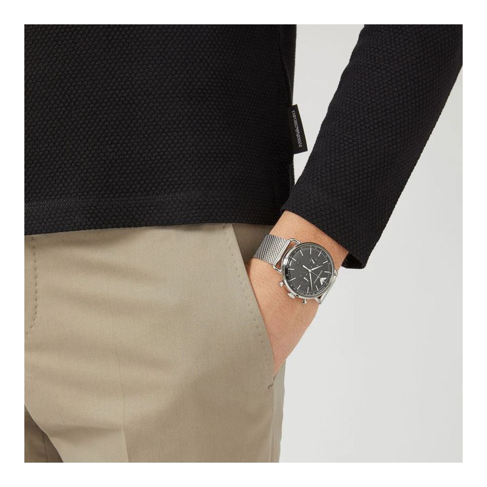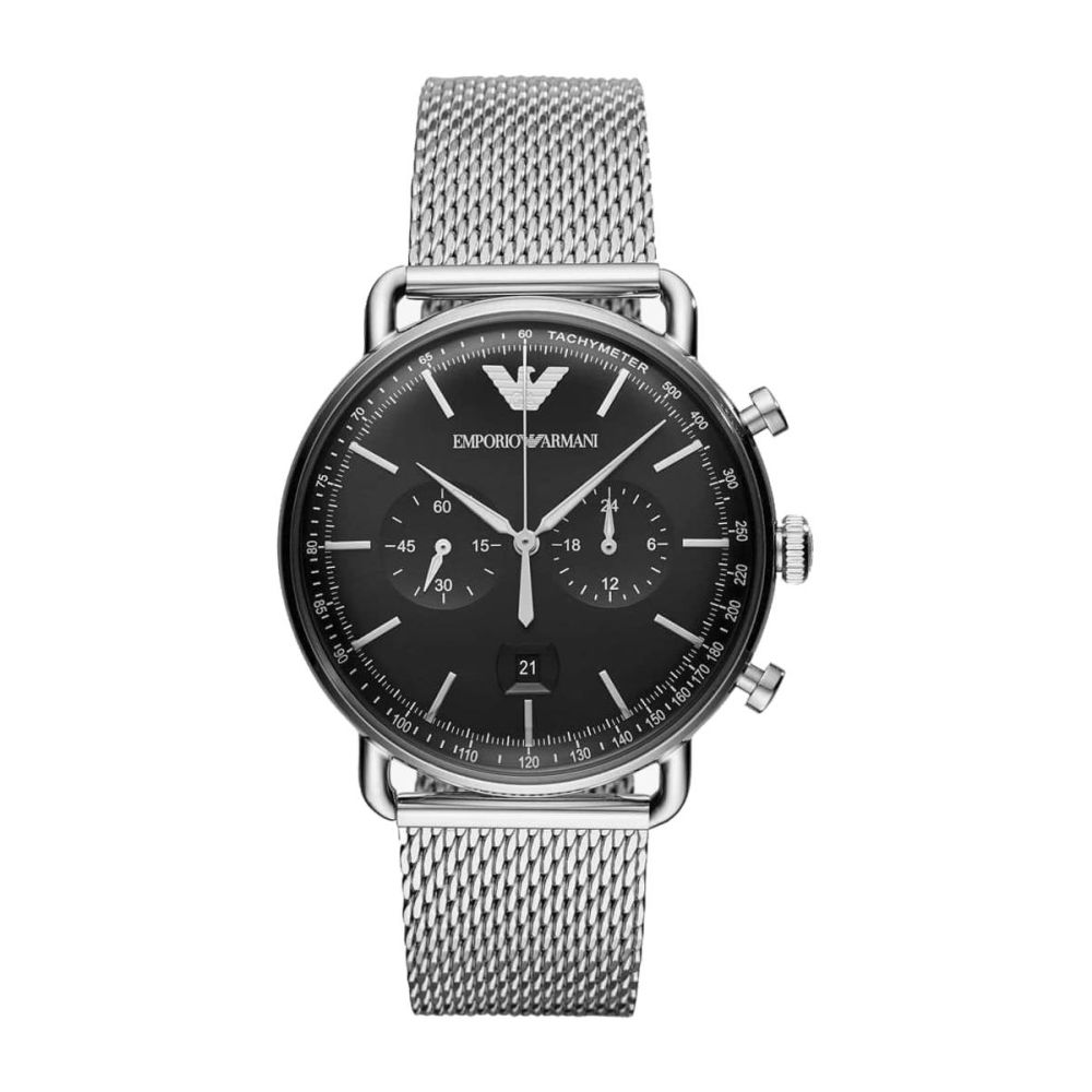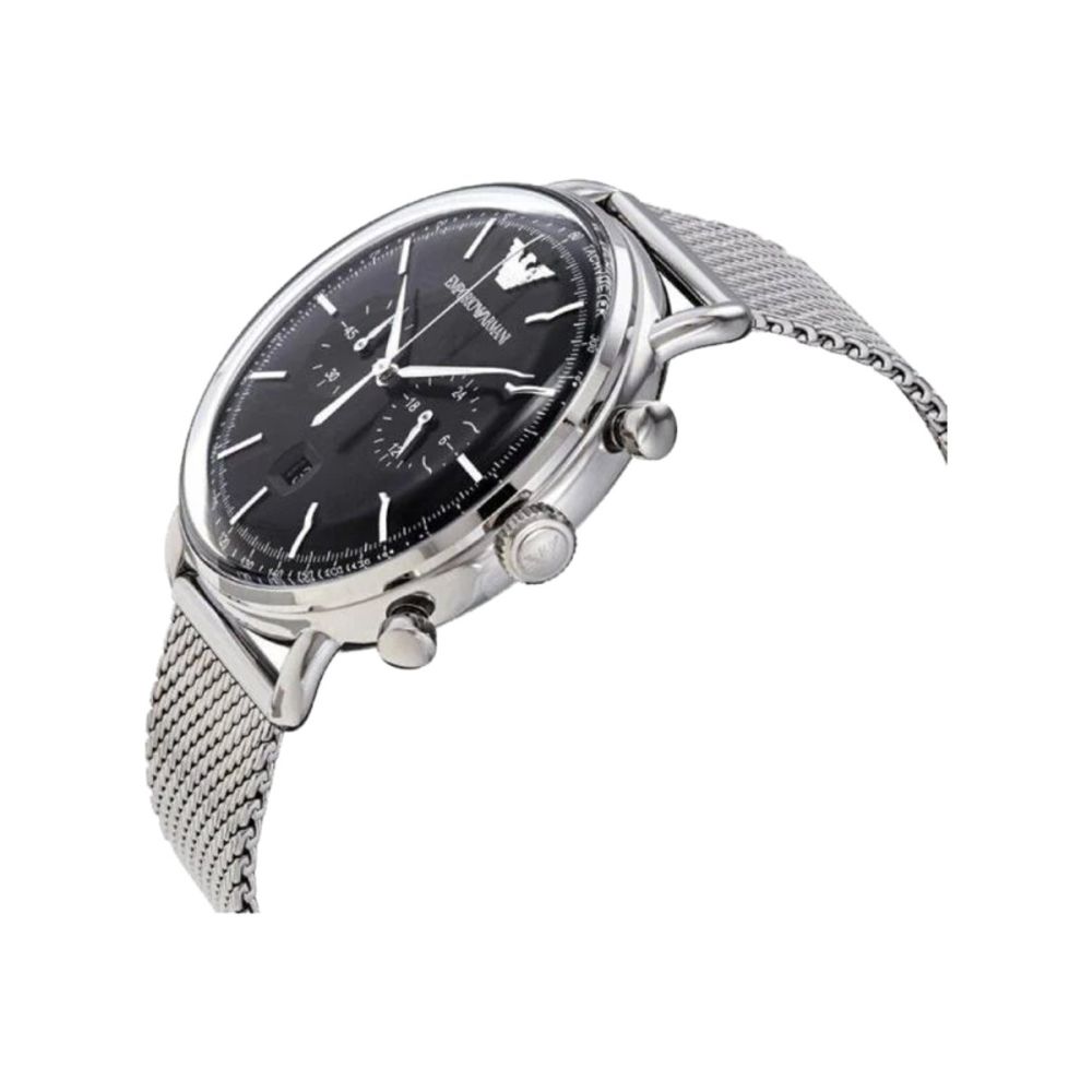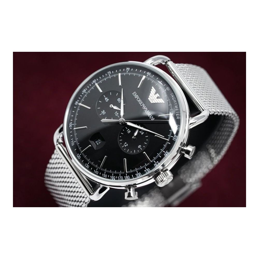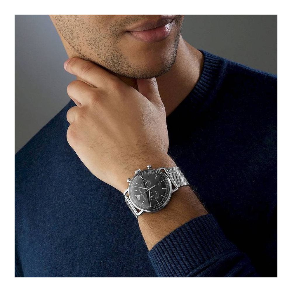 Relógio Emporio Armani Aviator AR11104. Este relógio Emporio Armani tem uma caixa com diâmetro aproximado de 49 mm, cor prateada, bracelete cor prateada e mostrador preto. Está equipado com um movimento quartzo. O relógio é estanque até 50 m | 5 bar | 5 atm. Composição: aço.