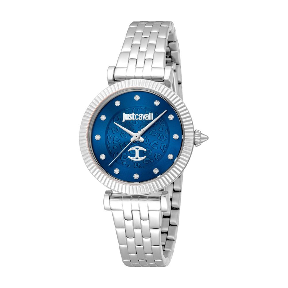 Relógio Just Cavalli JC1L266M0015. Este relógio Just Cavalli tem uma caixa com diâmetro aproximado de 32 mm, cor prateada bracelete cor prateada e mostrador cor azul. Está equipado com um movimento quartzo. O relógio é estanque até 30 m | 3 bar | 3 atm. Composição: aço e cristais zircónia.
