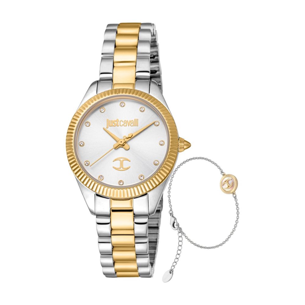 Relógio Just Cavalli Set JC1L267M0085. Este relógio Just Cavalli tem uma caixa com diâmetro aproximado de 30 mm, cor prateada e dourada bracelete cor prateada e dourada e mostrador cor branca. Está equipado com um movimento quartzo. O relógio é estanque até 50 m | 5 bar | 5 atm. Composição: aço e cristais zircónia.