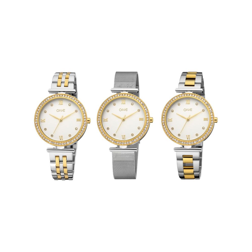 A Box One Desire é a escolha ideal para quem procura versatilidade, elegância e personalidade num só conjunto. Com um mostrador branco minimalista, o relógio apresenta três ponteiros dourados (horas, minutos e segundos) e índices cuidadosamente trabalhados: quatro números romanos em dourado e cristais brancos cravados a marcar as restantes horas, conferindo um brilho discreto e sofisticado ao pulso. O grande destaque desta box está na possibilidade de personalização: inclui dois aros intercambiáveis que transformam completamente o visual do relógio. Para um look elegante e intemporal, o aro prateado é a escolha ideal. Para quem prefere um toque de glamour, o aro dourado com cristais cravados por todo o contorno adiciona brilho e sofisticação ao conjunto. Mantendo o ADN das icónicas boxes One, esta edição apresenta duas braceletes distintas: uma bracelete bicolor em elos prateados e dourados e uma bracelete em malha prateada, que oferece leveza e conforto. Com a Box One Desire, um só relógio revela múltiplas facetas, adaptando-se perfeitamente a diferentes estilos, ocasiões e momentos.