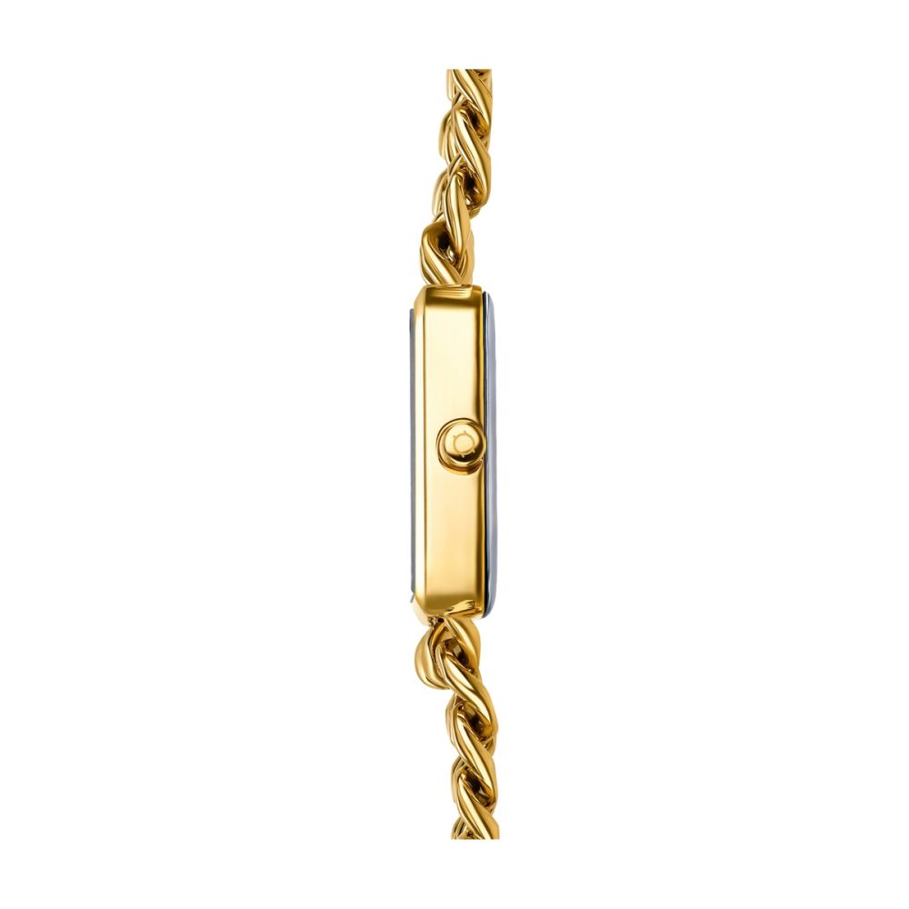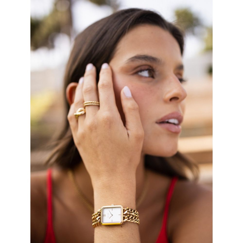 A bracelete dourada de elos entrelaçados cria o efeito visual de duas pulseiras, acrescentando sofisticação ao conjunto. Mas é o formato retangular do mostrador que marca realmente a diferença.