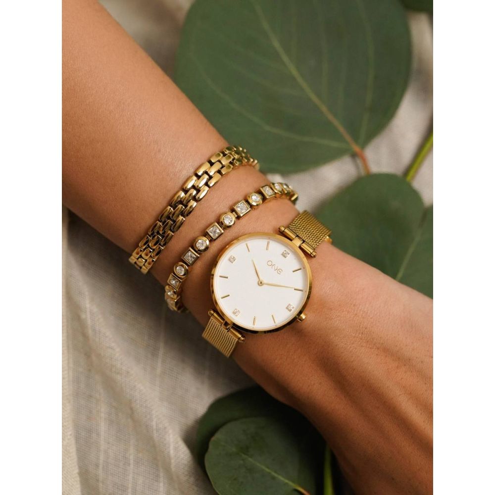 A caixa redonda em aço inoxidável dourado envolve um mostrador de fundo branco, criando um contraste suave que valoriza cada detalhe. Os índices lineares, também em dourado, são acompanhados por quatro cristais zircónicas brancas estrategicamente posicionados, que acrescentam brilho e reforçam o caráter elegante do modelo. Os ponteiros finos, no mesmo tom, mantêm a coerência visual e garantem uma leitura clara. A bracelete em malha mesh dourada complementa o design com um acabamento uniforme e sofisticado, adaptando-se confortavelmente ao pulso. O fecho ajustável permite regular facilmente o tamanho, tornando-o prático e confortável para uso prolongado.