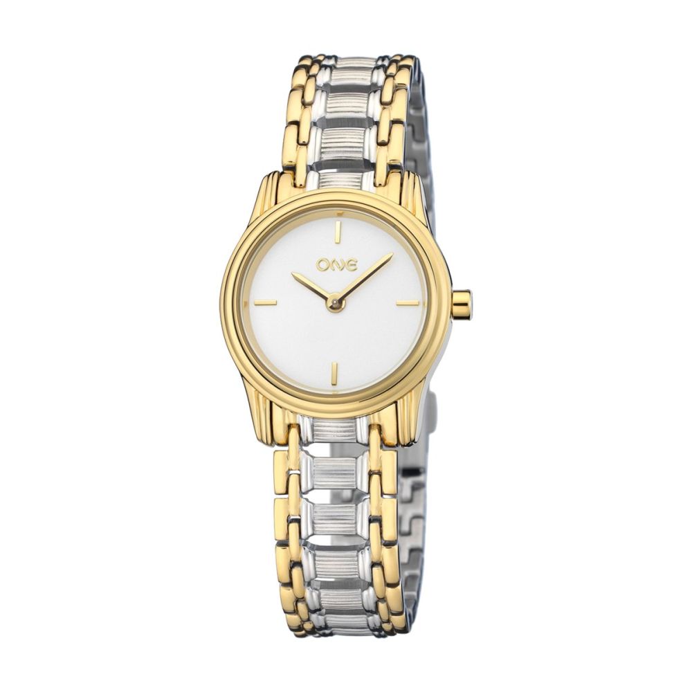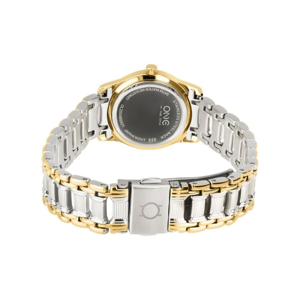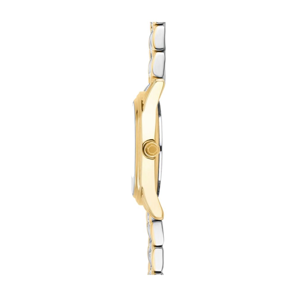O destaque recai sobre a bracelete bicolor em aço inoxidável, a verdadeira protagonista desta criação. Com um design composto por elos centrais prateados interligados por elos laterais dourados, esta combinação de tons eleva a elegância do modelo e torna-o perfeito para conjugar com diferentes estilos e acessórios. O mostrador de fundo branco mantém o equilíbrio visual da peça, realçado pelos índices em traço fino e dourado e pelos ponteiros delicados na mesma tonalidade.